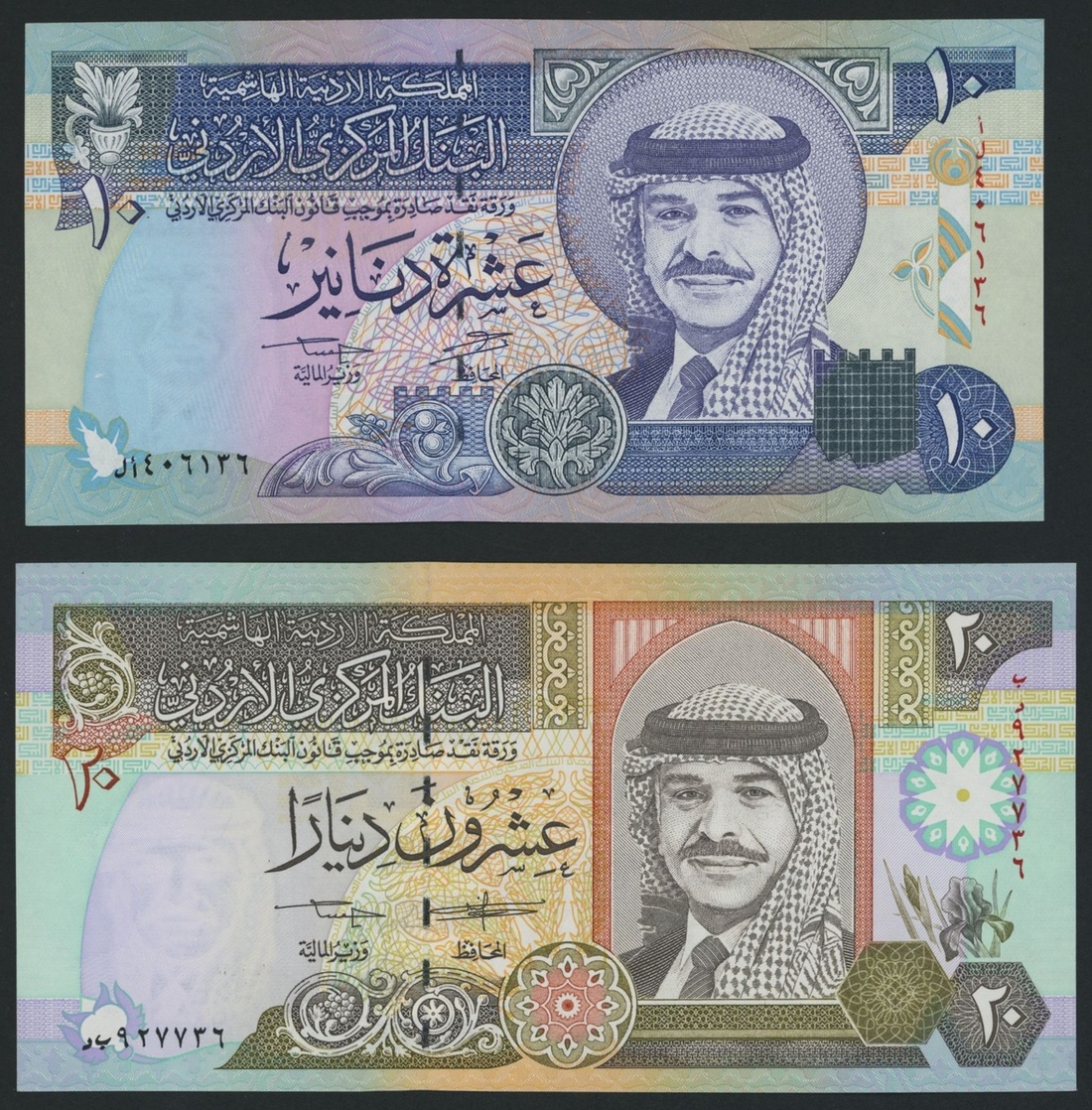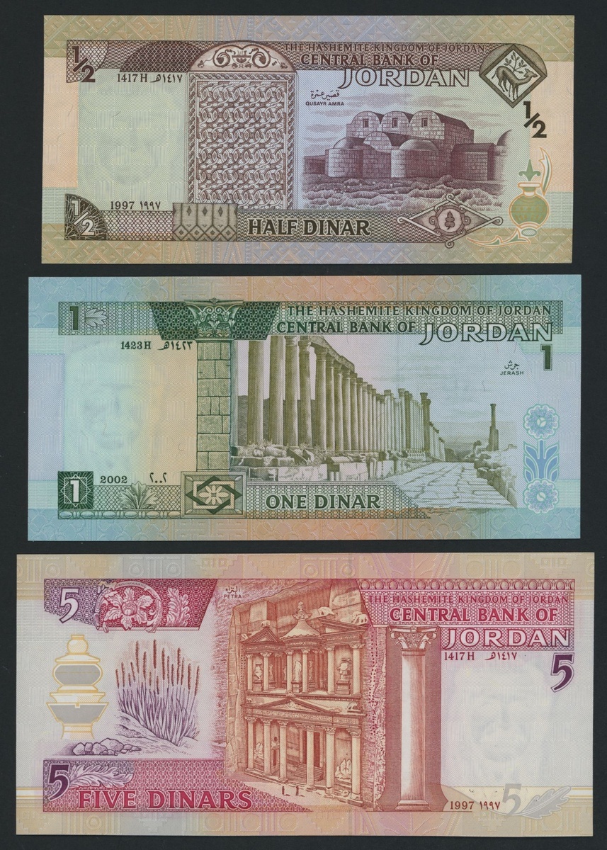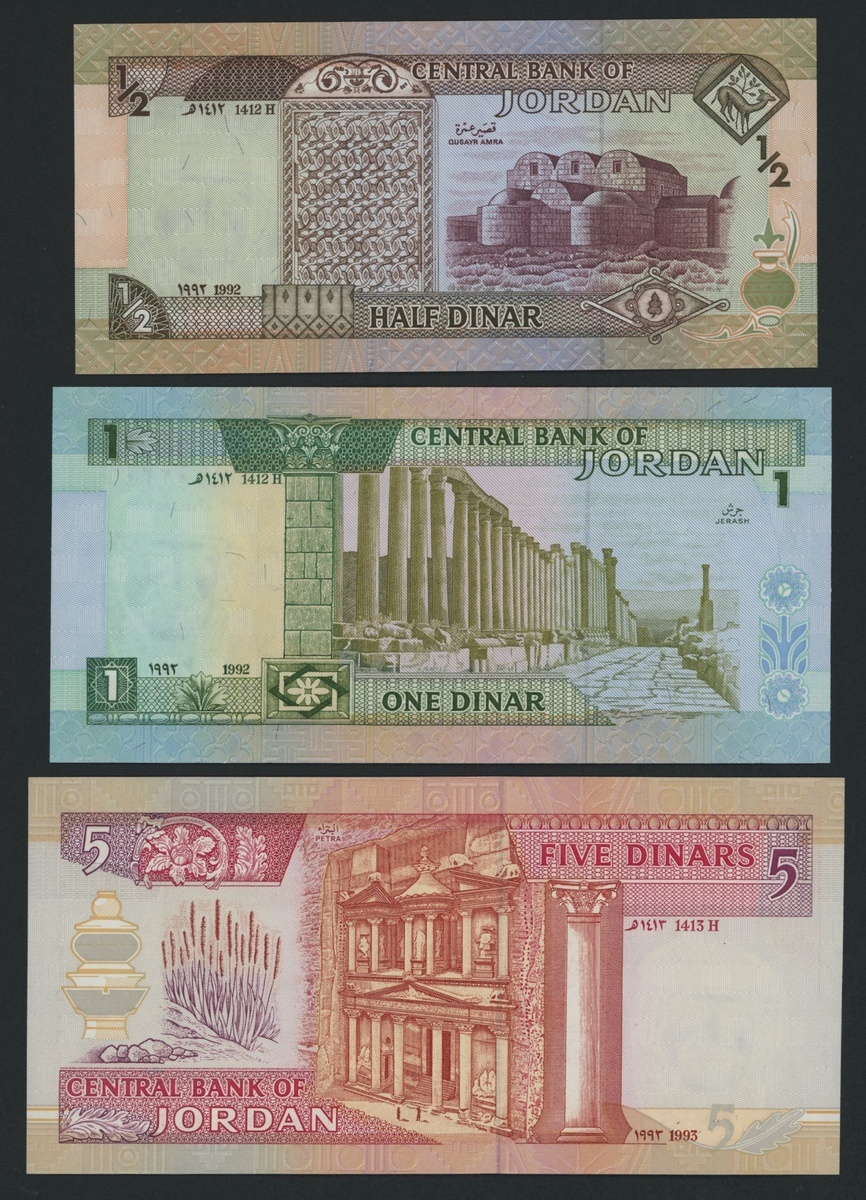 (x) Central Bank of Jordan, [10 notes] 1/2, 1, 5, 10 & 20 Dinars, 1992-2002, several low serial numbers,