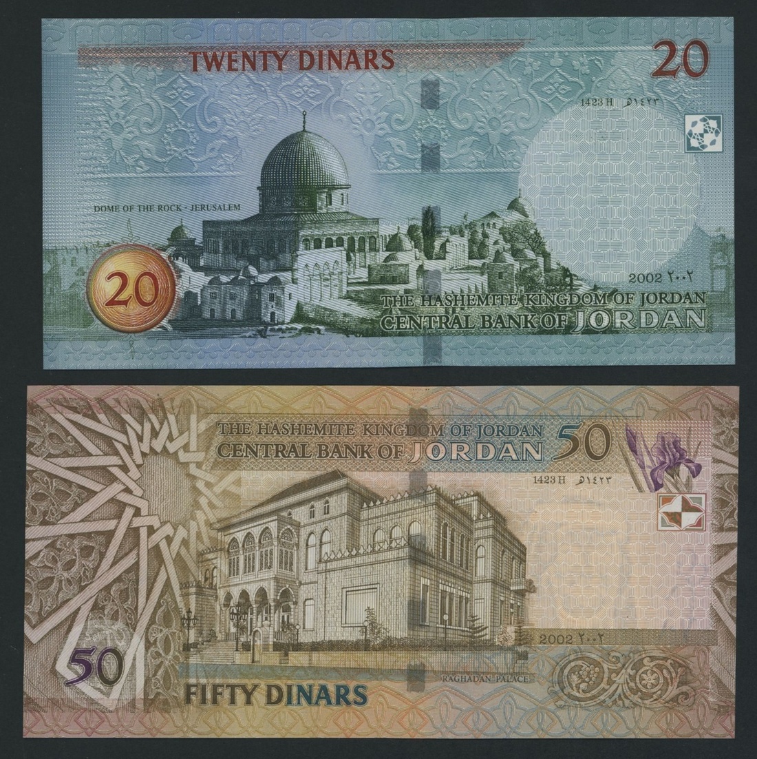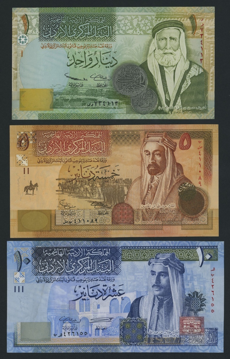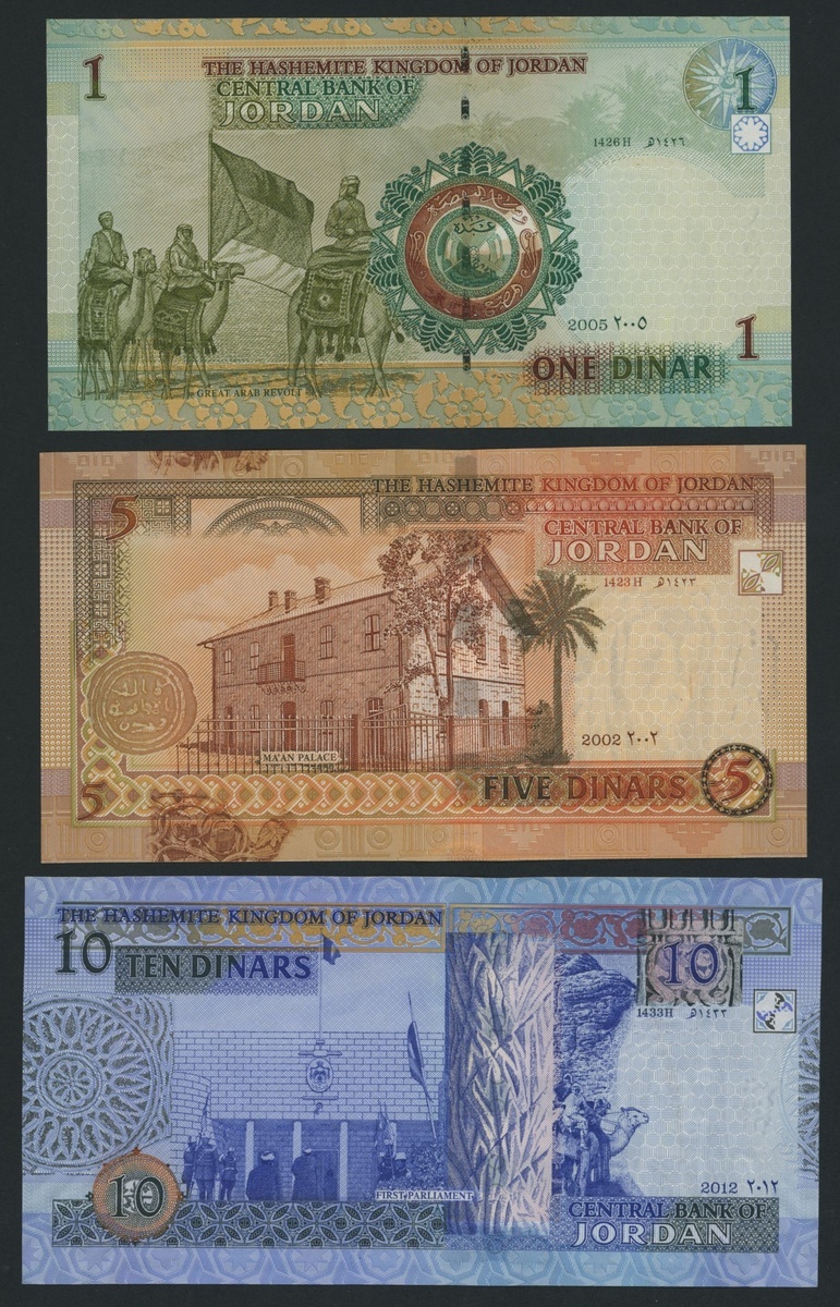 (x) Central Bank of Jordan, [5 notes] 1, 5, 10, 25 & 50 Dinars, 2002-12, (Pick 34b, 35a, 36d, 37a, 38a), about uncirculated