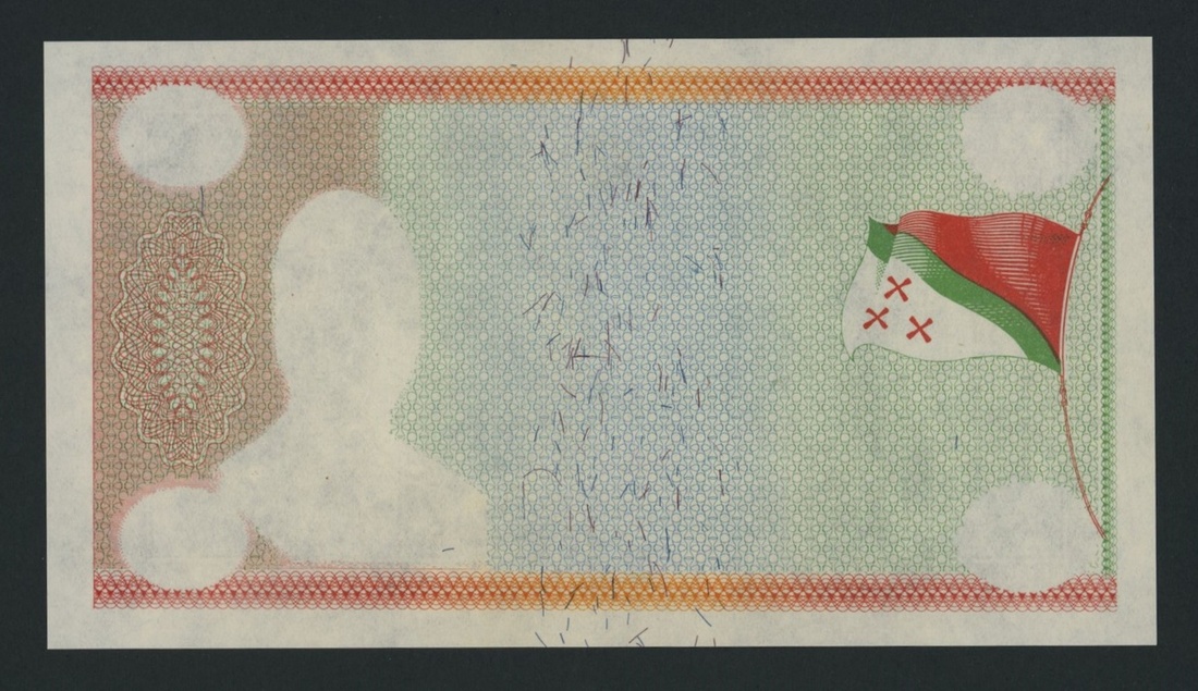 Banque Nationale du Katanga, partially printed 10 Francs katangais, ND (1 December 1960), no serial numbers, obverse showing multicolour underprint only, including flag at right, reverse fully printed, foundry at centre, value at left and right