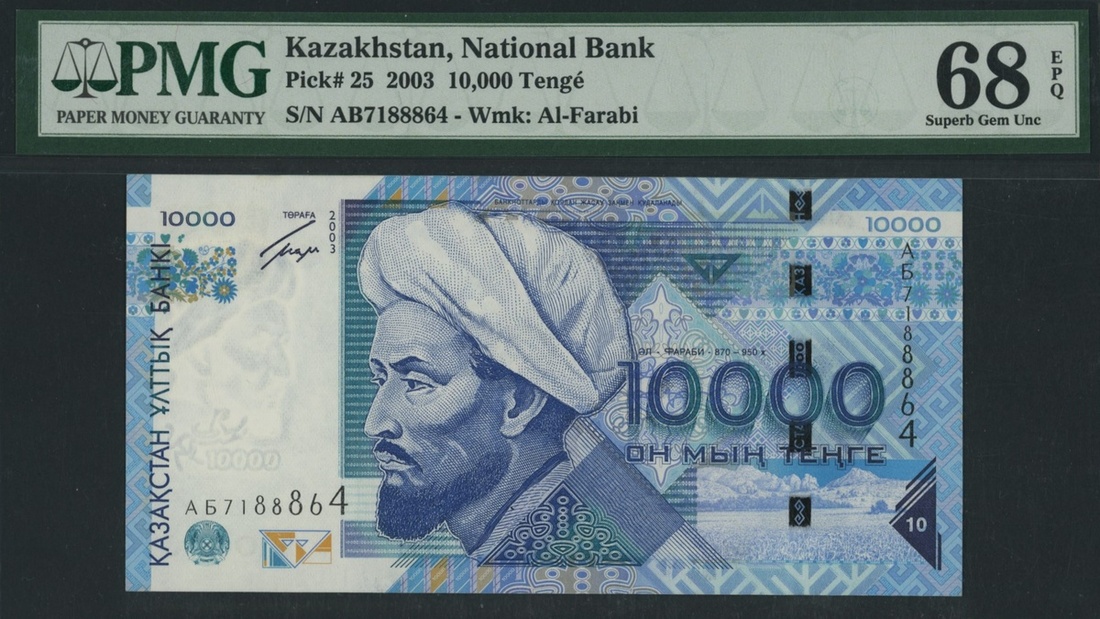 National Bank, Kazakhstan, *TOP POP* 10,000 Tengé, 2003, serial number AB7188864, (Pick 25), in PMG holder 68 EPQ Superb Gem Uncirculated
