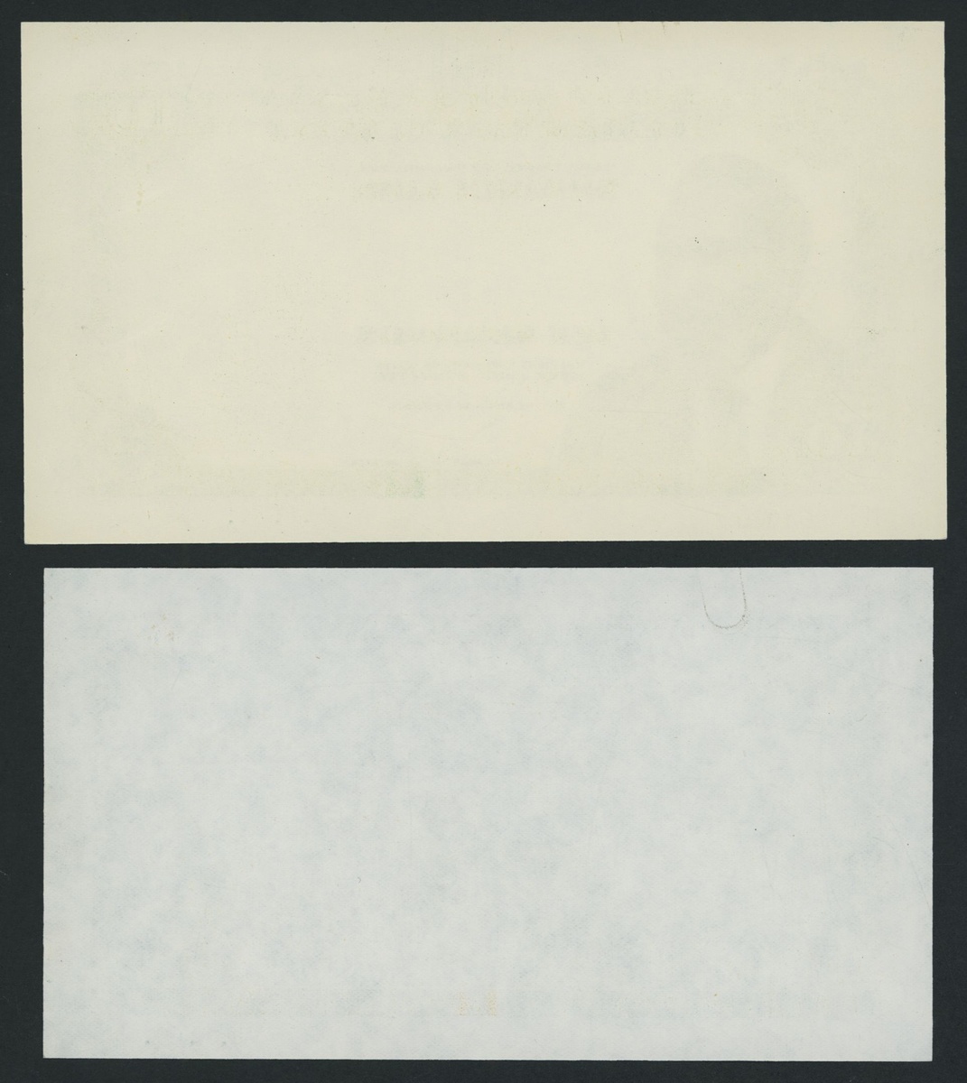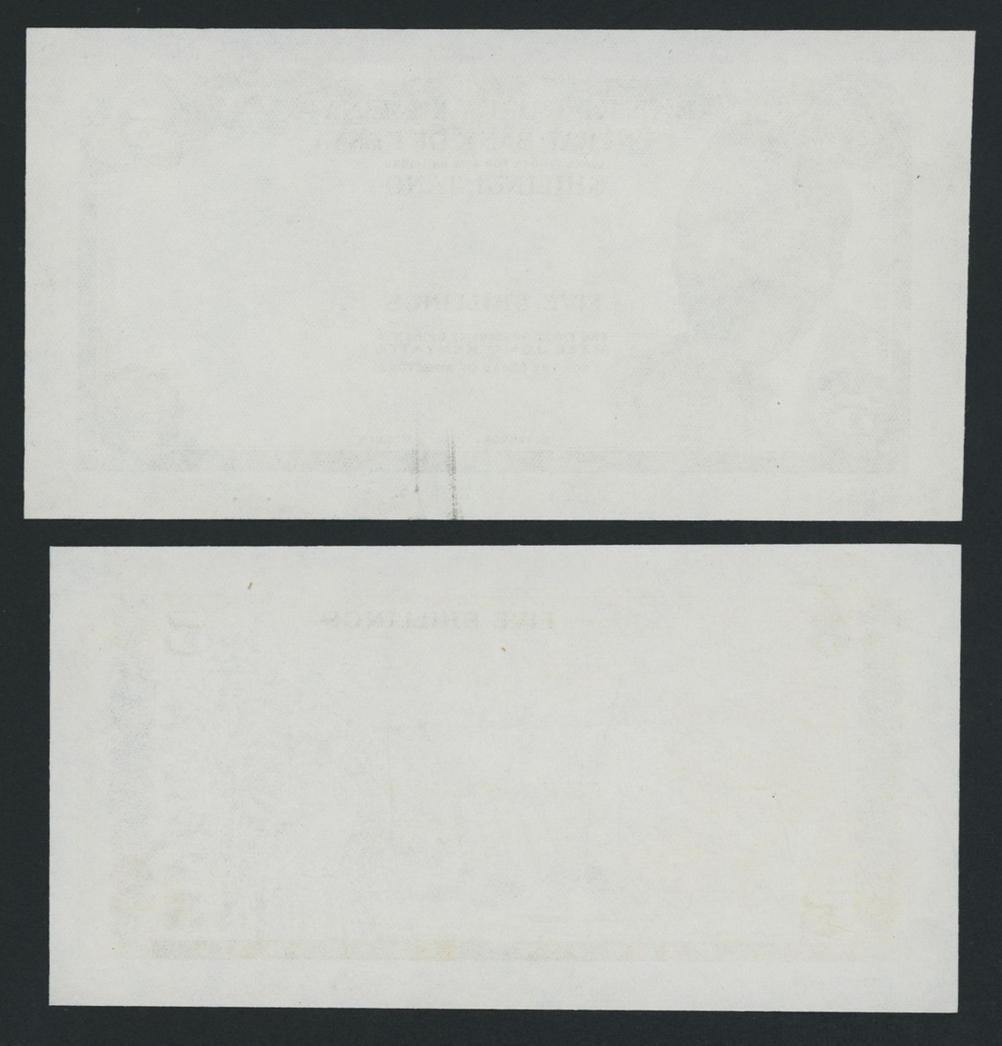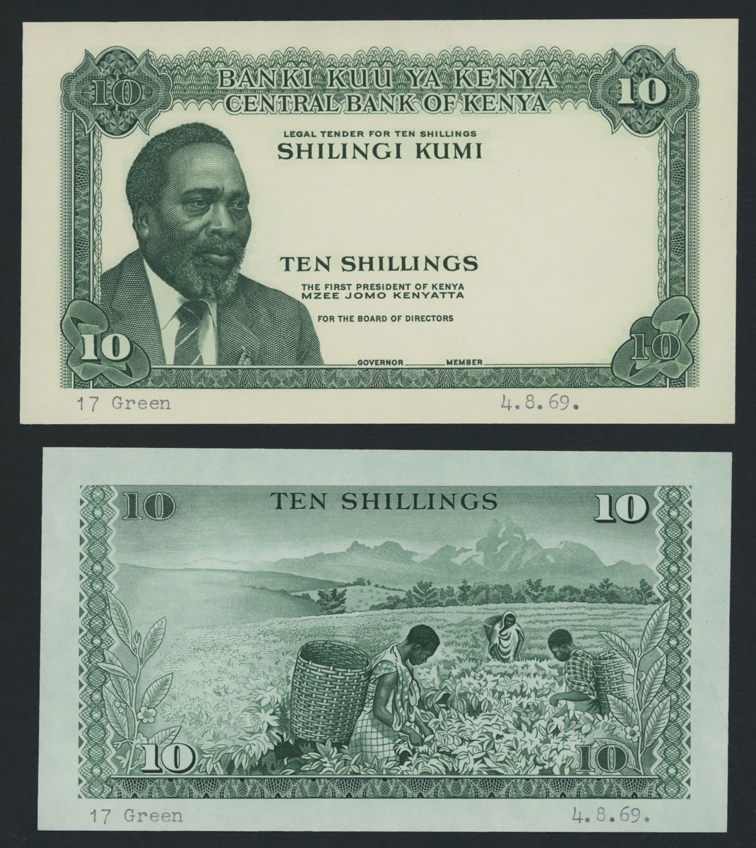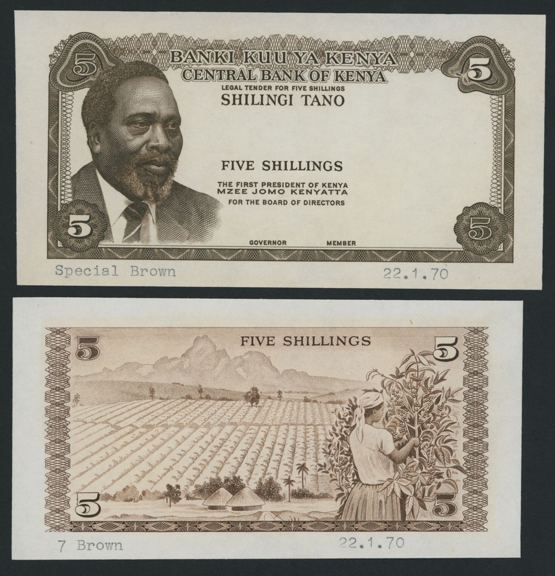 (x) Central Bank of Kenya, an obverse and reverse die proof 5/-, ND (1970), dark brown and white, President Kenyatta at left, reverse brown and white, Mount Kenya and coffee plantation, together with an obverse and reverse die proof 10/-, green and white, design as 5/- but tea cultivation on reverse