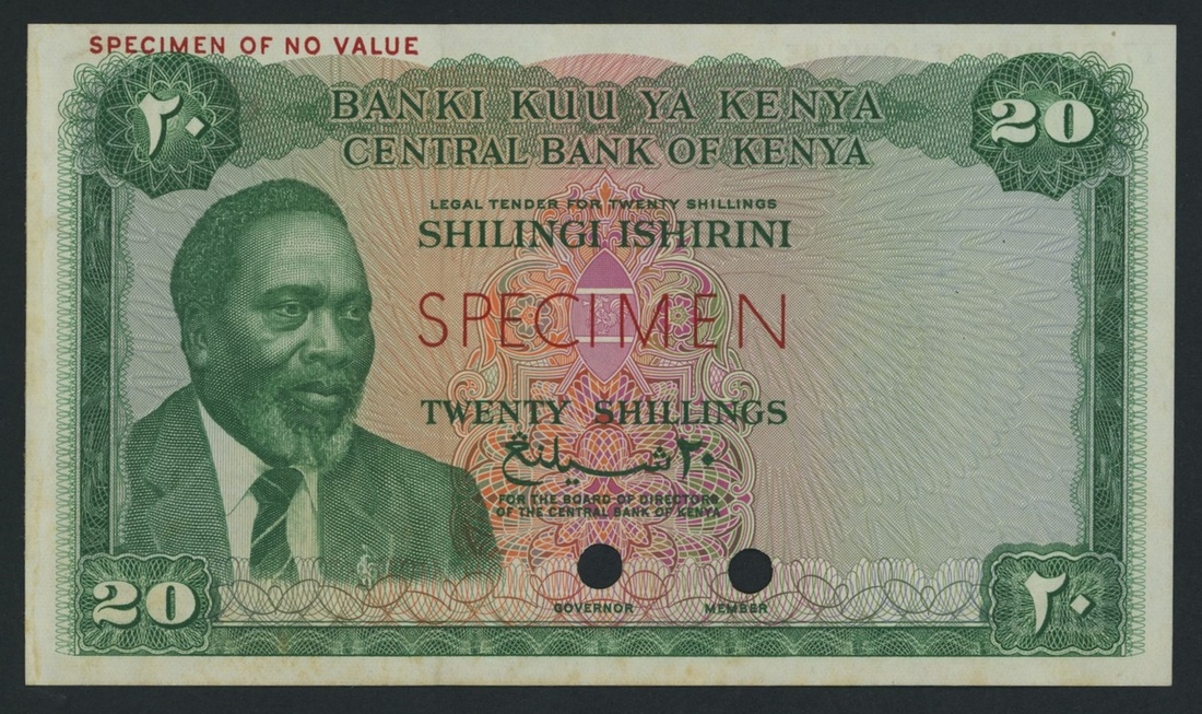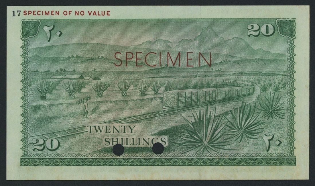 (x) Central Bank of Kenya, colour trial 20/-, ND (1966), no serial numbers, green and multicoloured, President Kenyatta at left, reverse green, sisal train, Mount Kenya in background