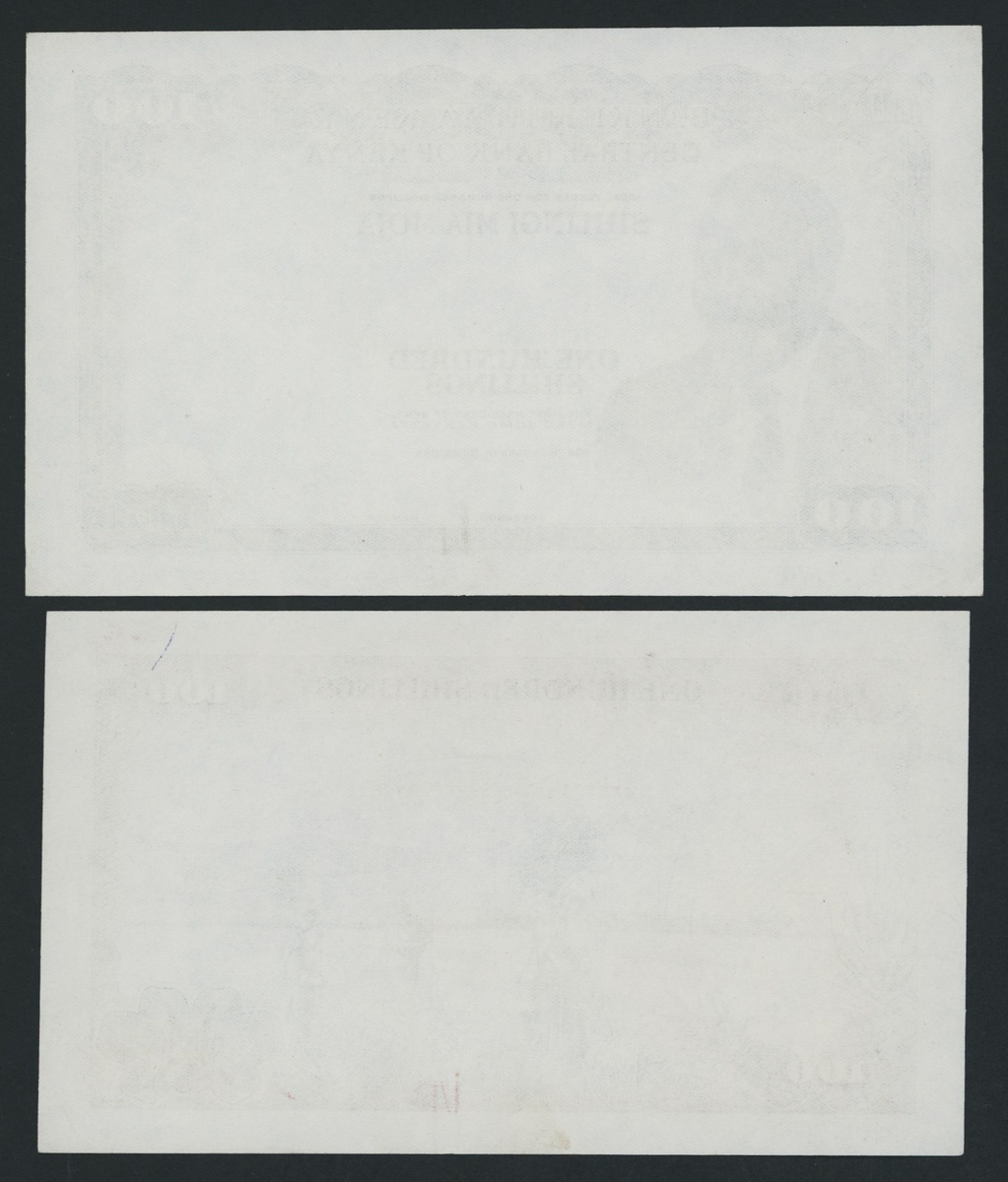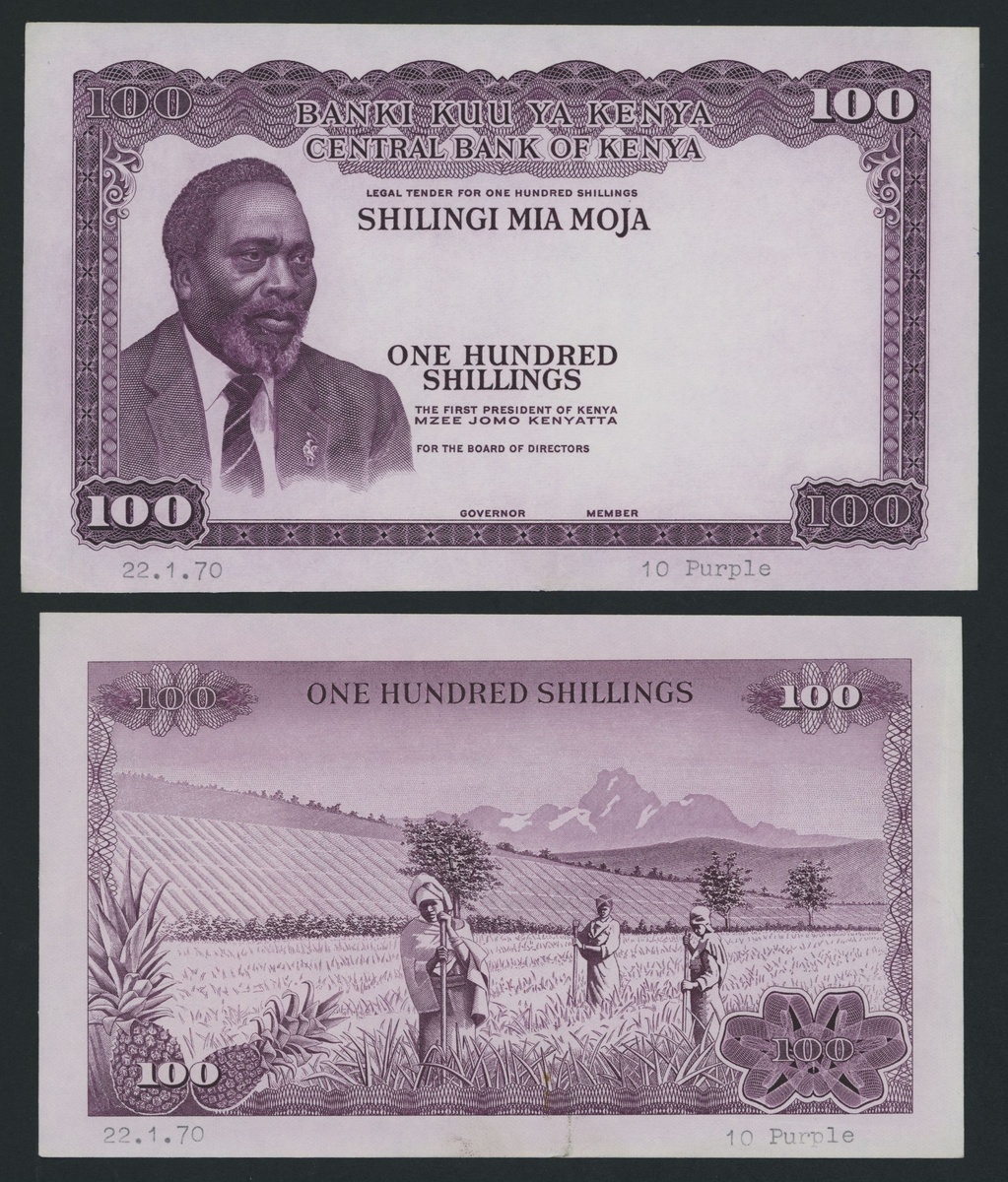 (x) Central Bank of Kenya, an obverse and reverse die proof 100/-, ND (1970), purple and white, President Kenyatta at left, reverse purple and white, pineapple cultivation, Mount Kenya in background