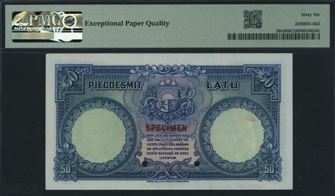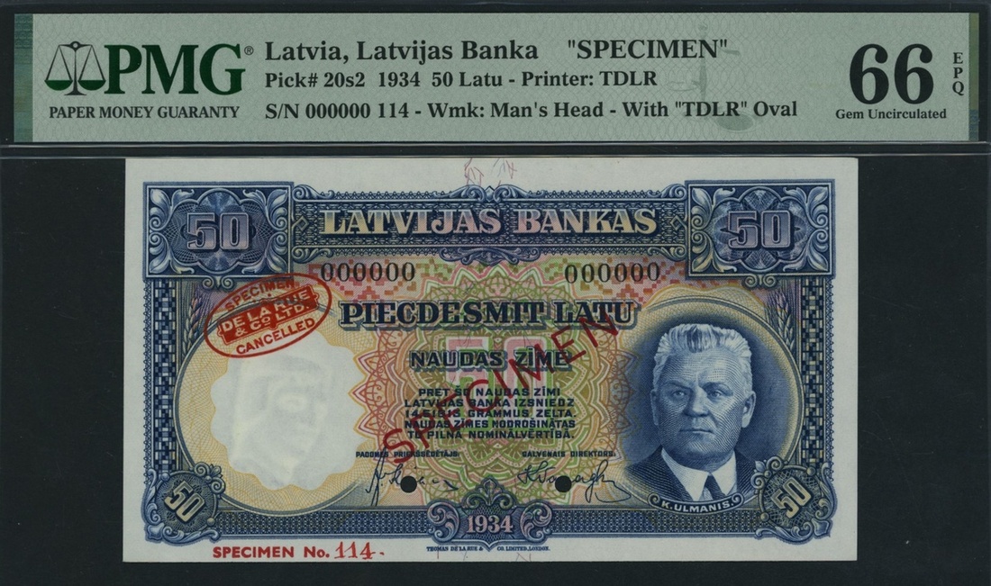 (x) Latvijas Banka, Latvia, Specimen 50 Latu, 1934, serial number 000000 114, (Pick 20s2), in PMG holder 66 EPQ Gem Uncirculated