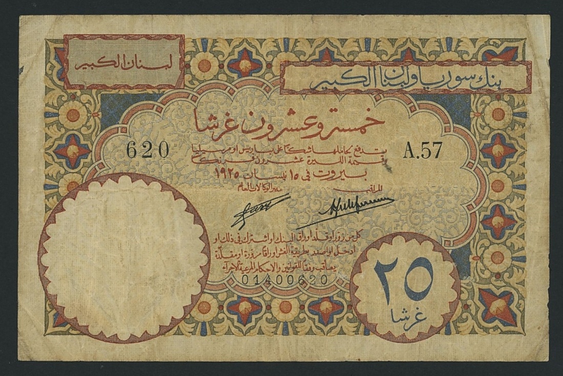 Banque de Syrie et du Grand-Liban, 25 Piastres, 1925, serial number A.57 620, (Pick 1, BNB 101), about very fine