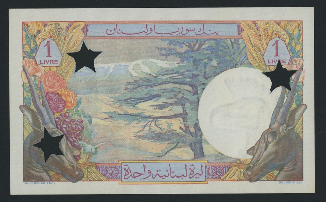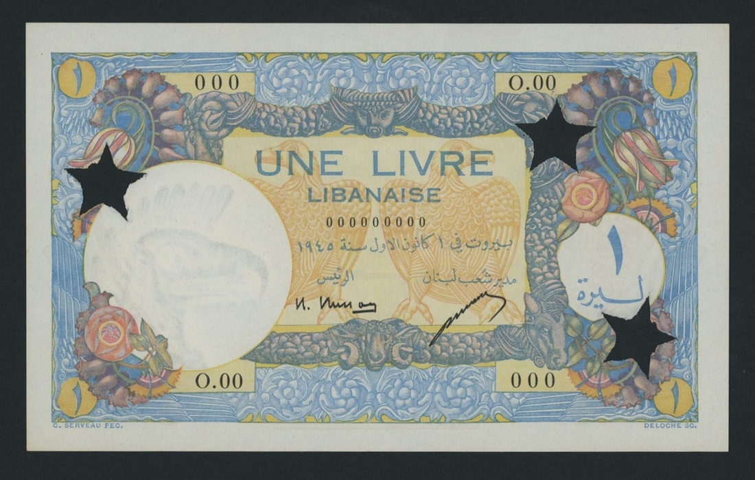 Banque de Syrie et du Liban, Lebanon, specimen 1 Livre, 1945, all-zero serial number, star perforations,