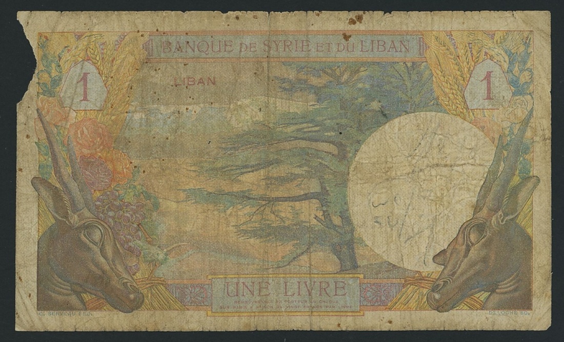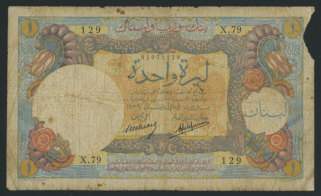 Banque de Syrie et du Grand-Liban, 1 Livre, 1939, serial number X.79 129, (Pick 15, BNB 201), very good, large piece missing and tears to edges, pinholes