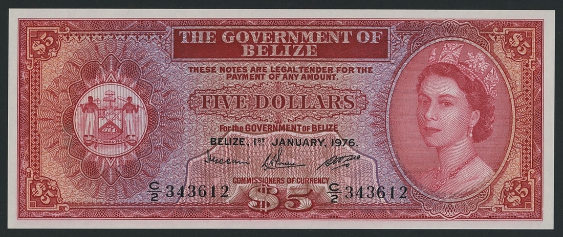 (x) Government of Belize, $5, 1st January 1976, serial number C/2 343612, (Pick 35b, BNB B103b), about uncirculated