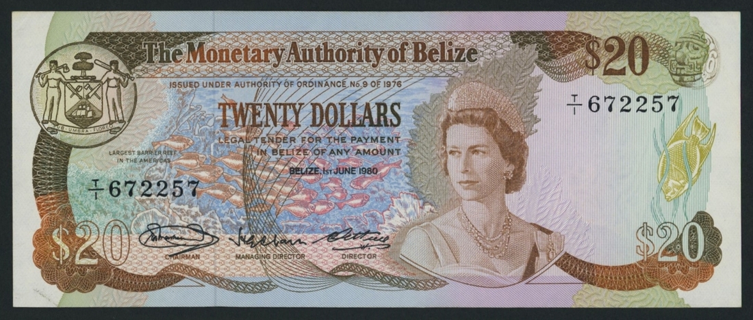 (x) Monetary Authority of Belize, $20, 1st June 1980, serial number T/1 672257, (Pick 41, BNB B204a), good extremely fine