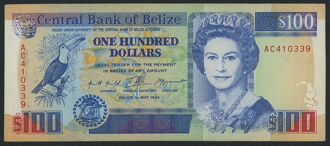 (x) Central Bank of Belize, $100, 1st May 1994, serial number AC 410339, (Pick 57c), extremely fine