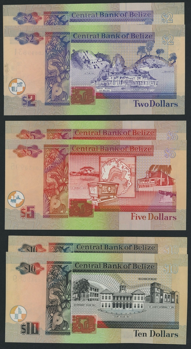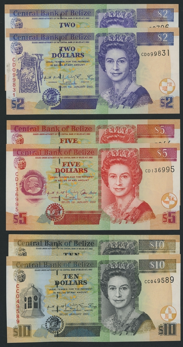 (x) Central Bank of Belize, [6 notes] $2, $5, $10, 1997-2002,