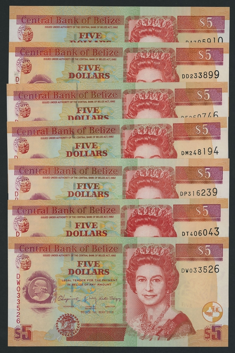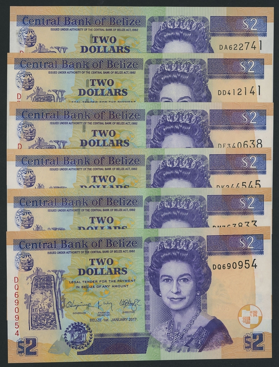 (x) Central Bank of Belize, [13 notes] $2, $5, 2003-2017, (Pick 66a-f, 67a-g), uncirculated