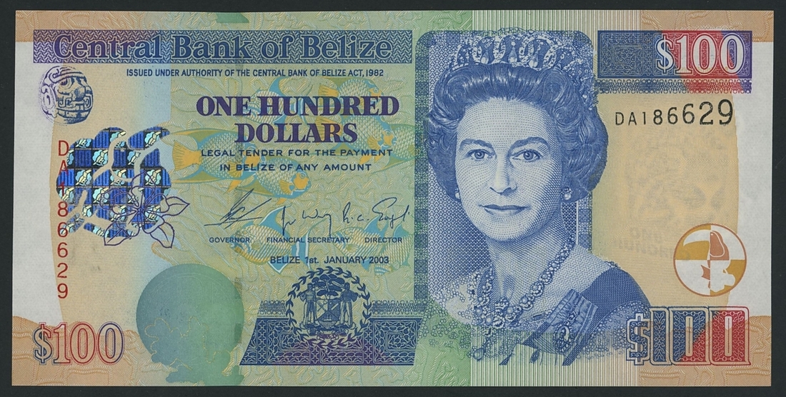 (x) Central Bank of Belize, $100, 1st January 2003, serial number DA 186629, (Pick 71a), uncirculated