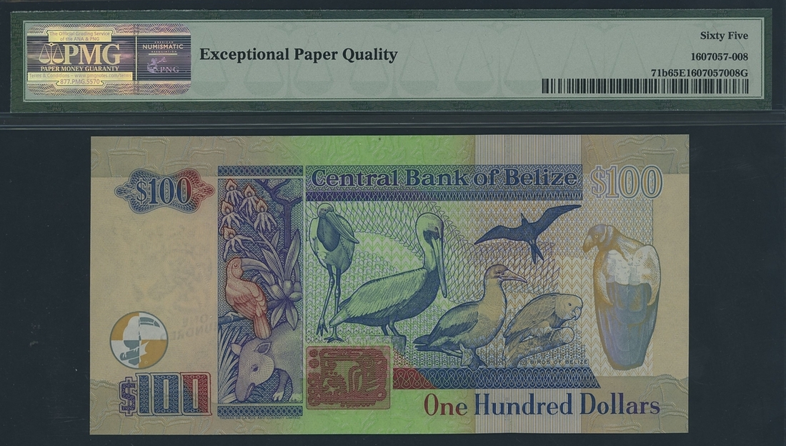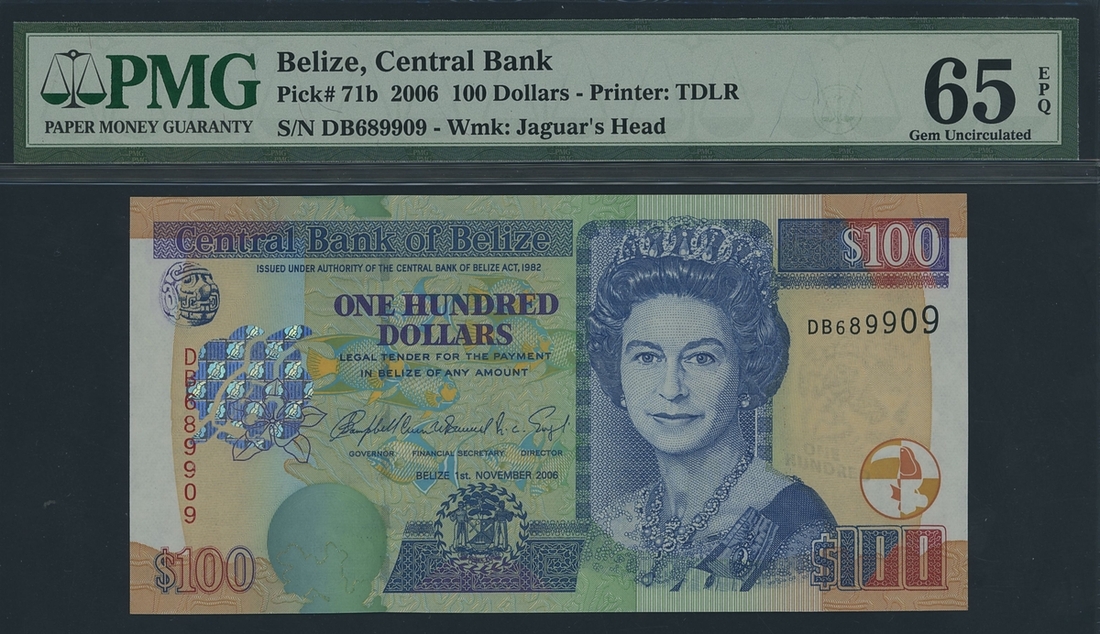 (x) Central Bank of Belize, $100, 1st November 2006, serial number DB 689909, (Pick 71b), in PMG holder 65 EPQ Gem Uncirculated