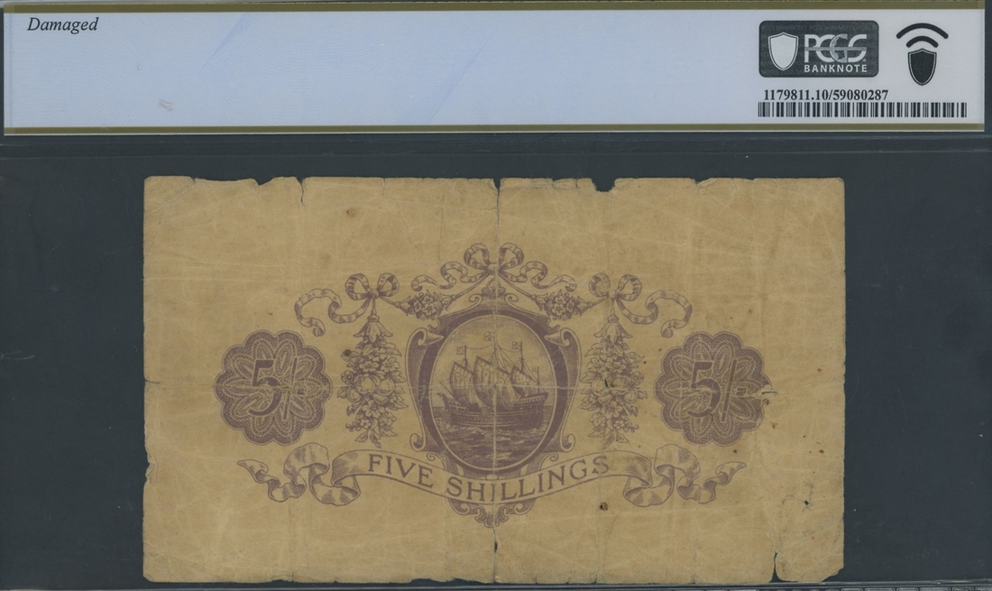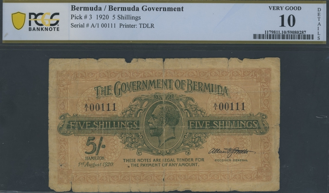 Government of Bermuda, 5/- Shillings, 1st August 1920, serial number A/1 00111, (Pick 3a), in PCGS holder 10 Very Good, damaged, rare
