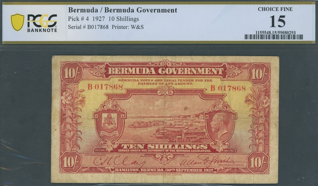 (x) Bermuda Government, 10/- Shillings, 30th September 1927, serial number B 017868, (Pick 4), in PCGS holder 15 Choice Fine