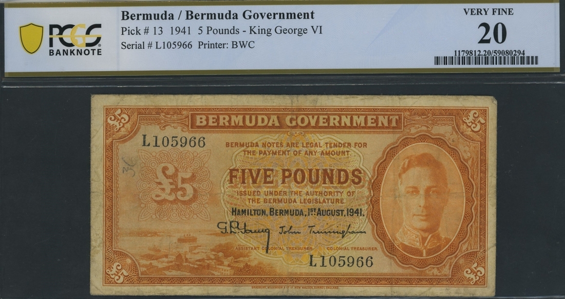 (x) Bermuda Government, £5, 1st August 1941, serial number L 105966, (Pick 13), in PCGS holder 20 Very Fine