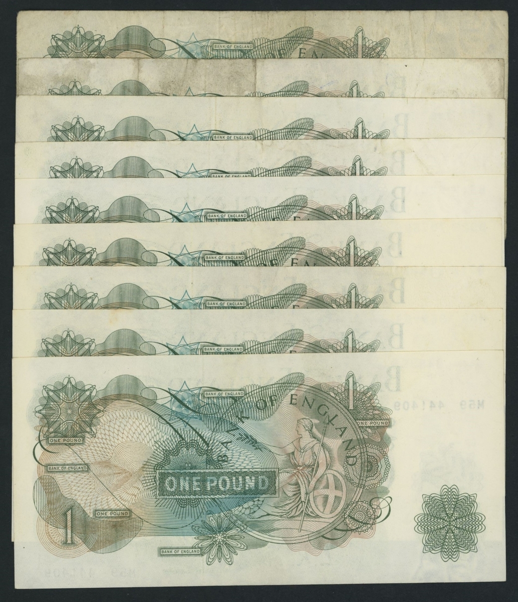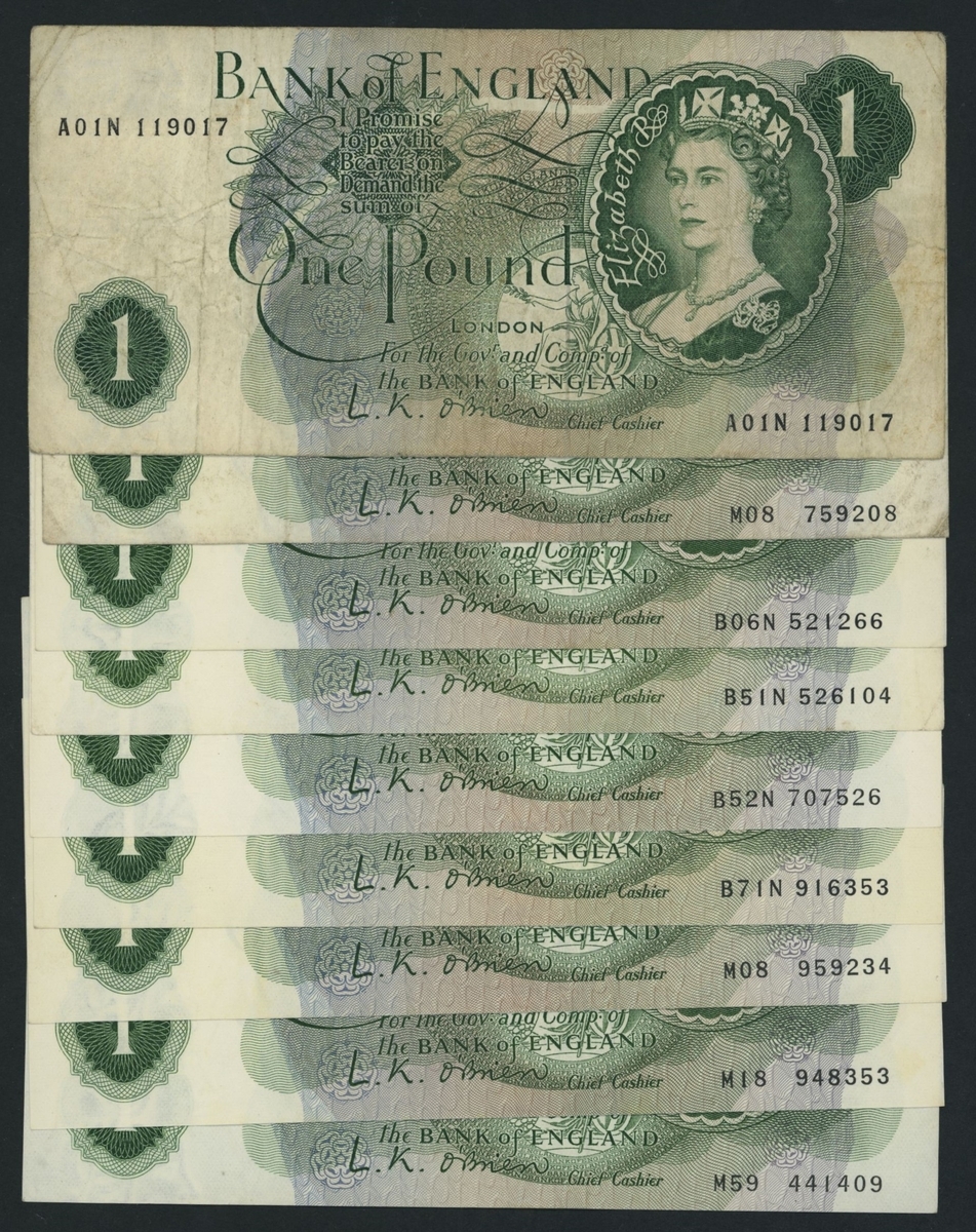 Bank of England, L. K. O'Brien, [9 notes] £1, ND (1960), including a first run experimental R on the reverse issue, serial number A01N 119017 and 4 replacement notes