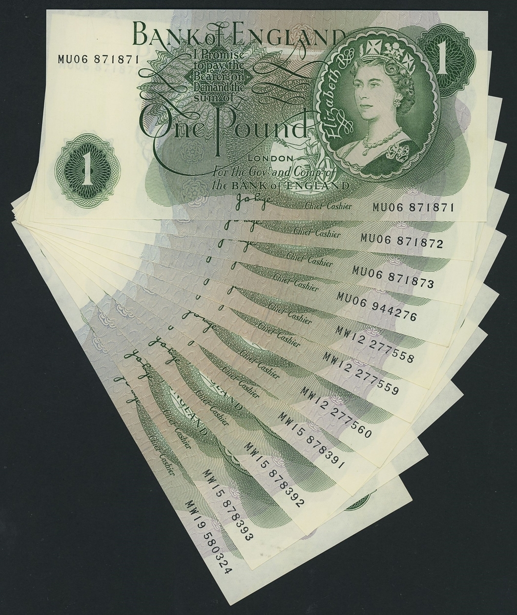 Bank of England, J. B. Page, [22 notes] replacement £1, ND (1971), including mid first prefix, last run prefix, and some consecutive serial numbers,