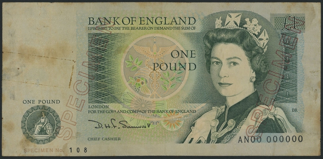 (x) Bank of England, specimen £1, D. H. F. Somerset, 1980-88, serial number AN00 000000, specimen number 108, (EPM B341sb), staining, some minor tears into margins, mounting remnants, otherwise very fine