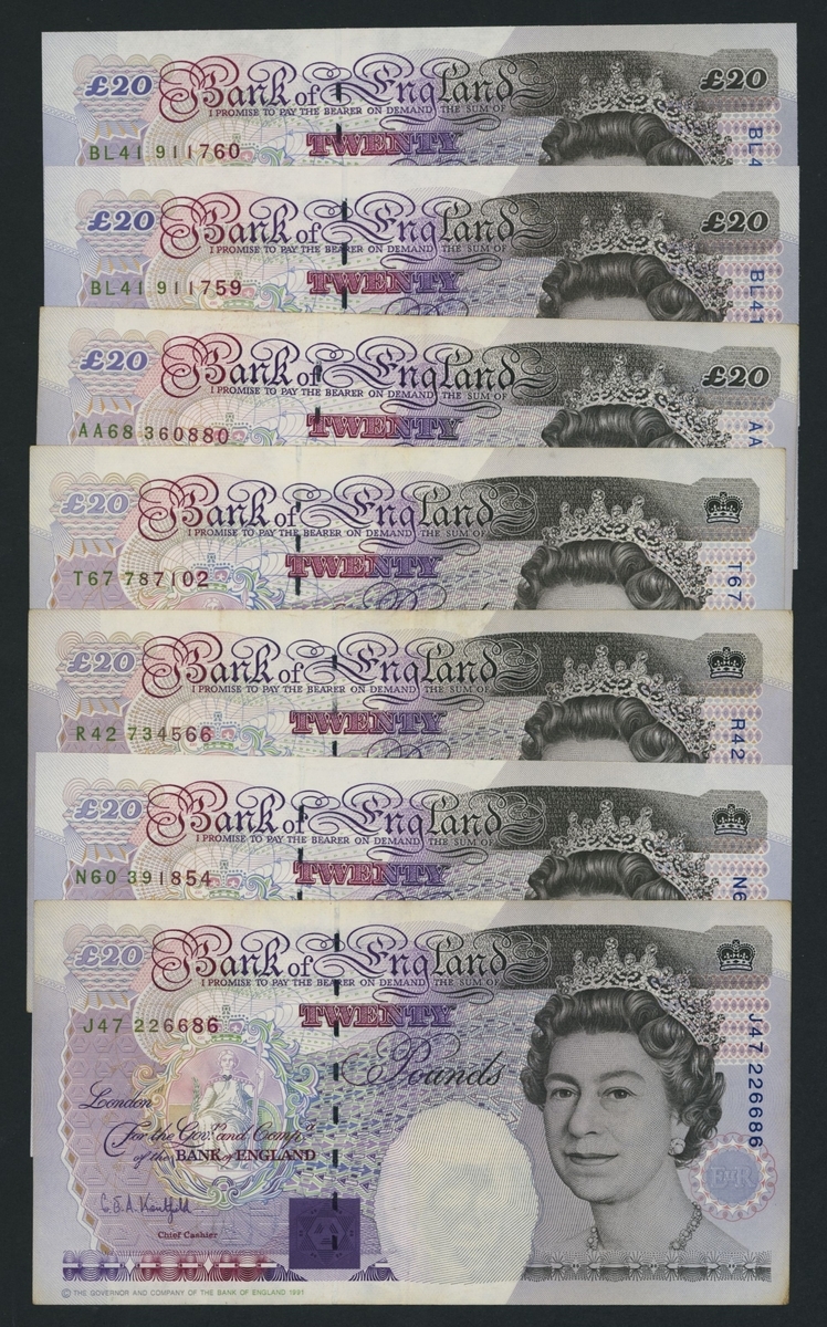 Bank of England, G. E. A. Kentfield, [8 notes] £20, £50, 1991-4, £20 (7), 1991, serial numbers J47 226686, N60 391854, R42 734566 and T67 787102, first series prefix AA68 360880 and pair of consecutive serial numbers BL41 91759-60,