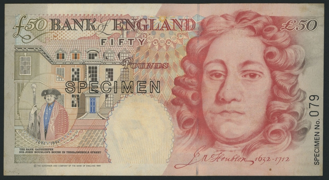 (x) Bank of England, specimen £50, G. E. A. Kentfield, 1994-98, serial number A00 000000, serial number 079, (EPM B377s), minor stains and mounting remnants, otherwise good very fine