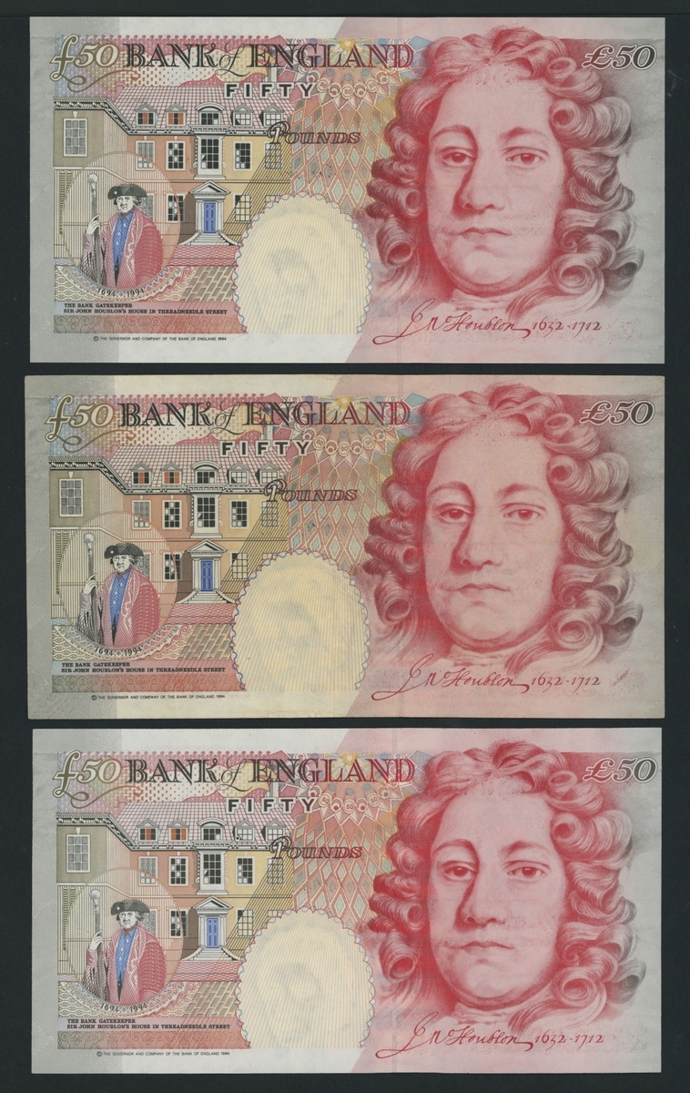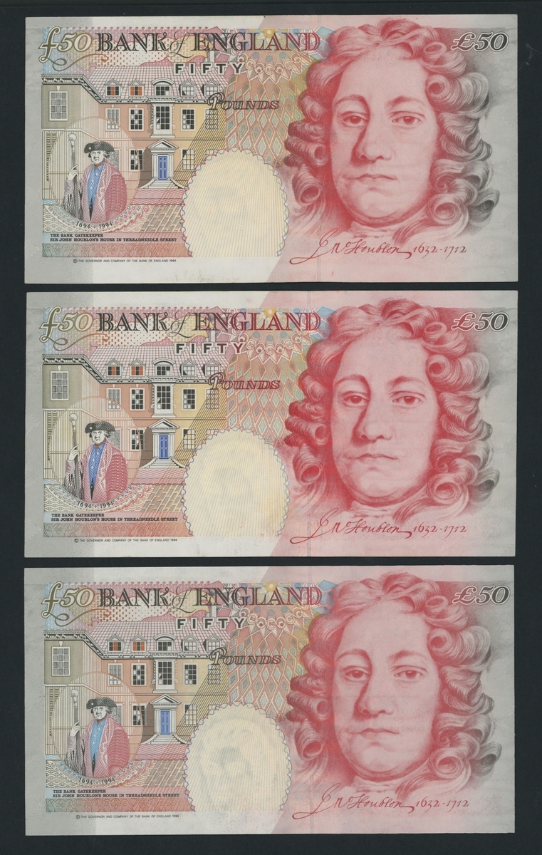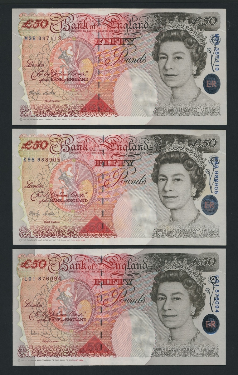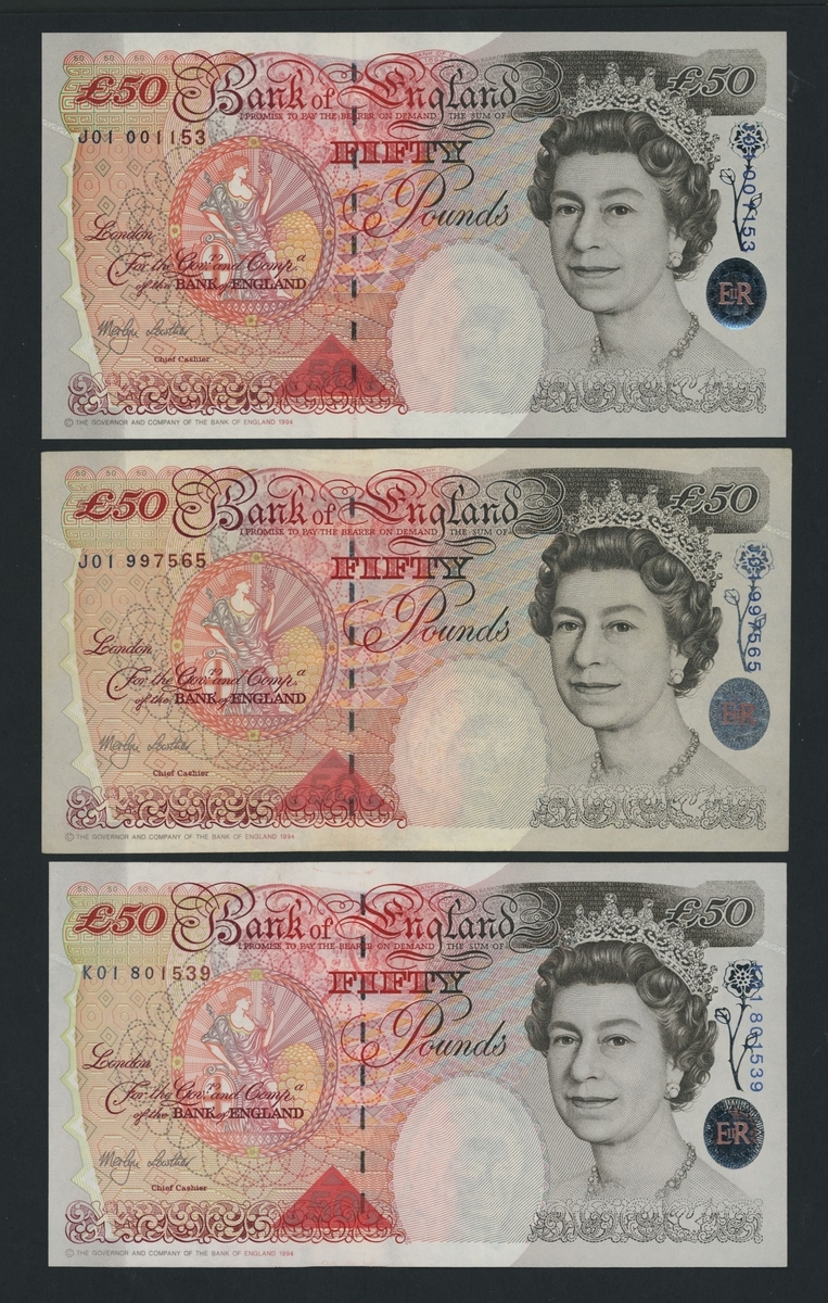 Bank of England, M. Lowther, [6 notes] £50, 1994 (1999), First Run serial numbers J01 001153 and J01 997565, serial numbers K01 801539, M35 387119 and Mid Last serial number K98 988905 and First serial number L01 876094