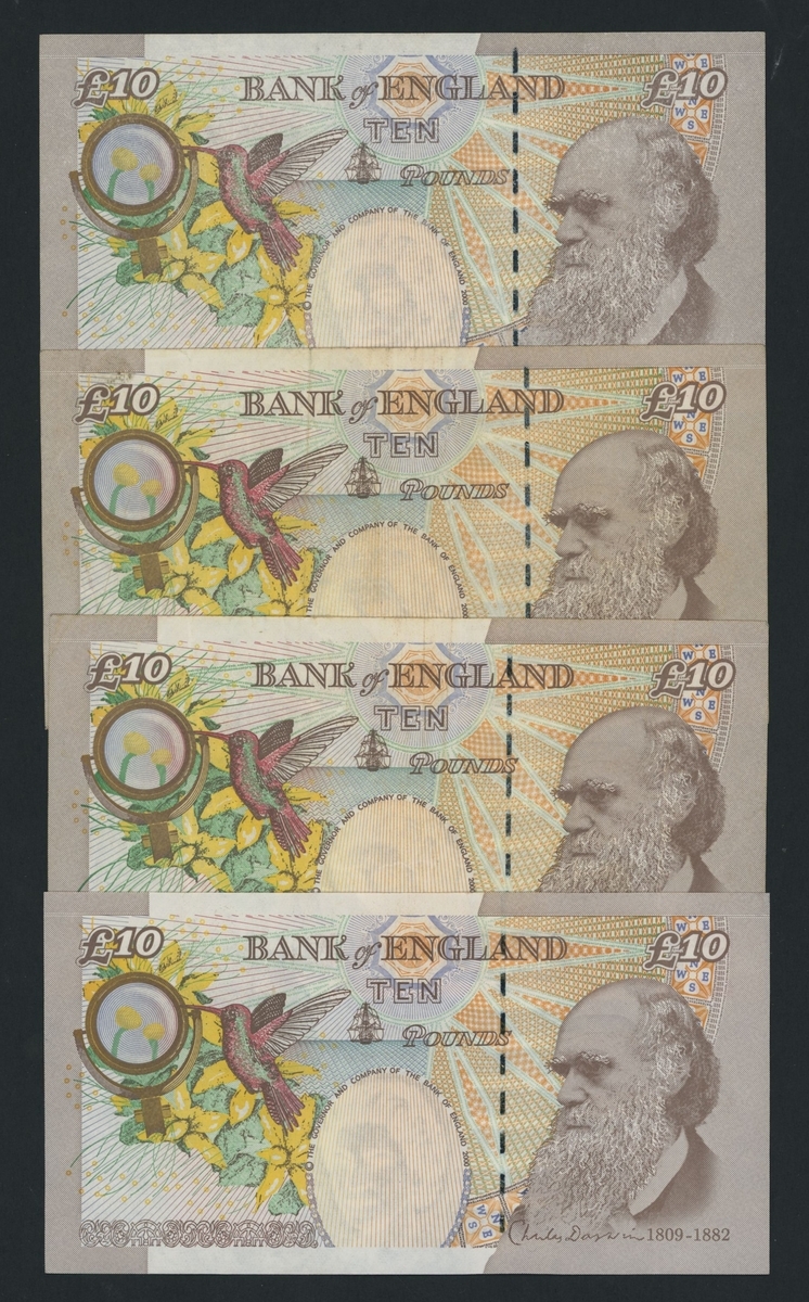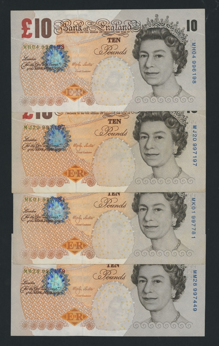Bank of England, M. Lowther, [4 notes] £10, ND (2000), Experimental Issue Circulation Trials serial numbers MH04 996198, MJ20 997197, MK01 997781, and MM28 997449