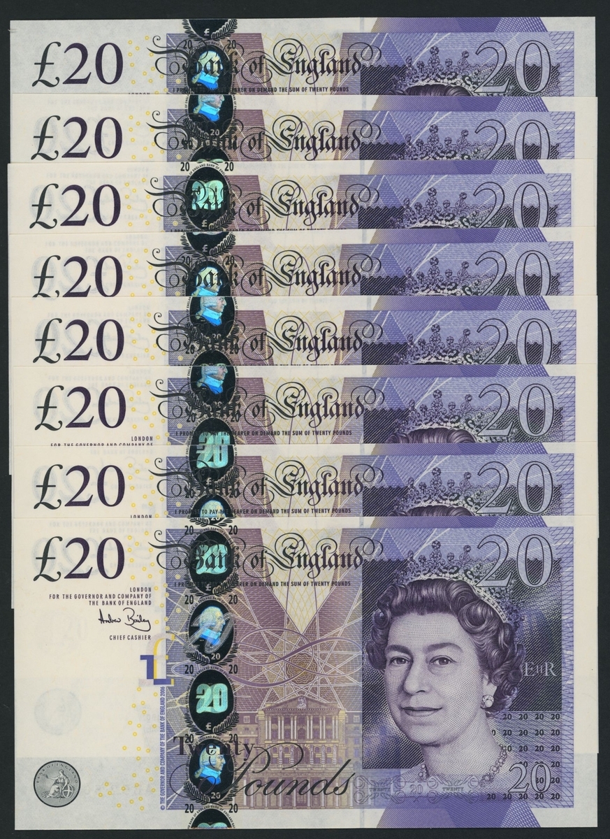 Bank of England, Andrew Bailey, [8 notes] £20, 2006, run of consecutive serial numbers AB36 044349-53 and serial numbers AB49 AB51 and AB52 500097,