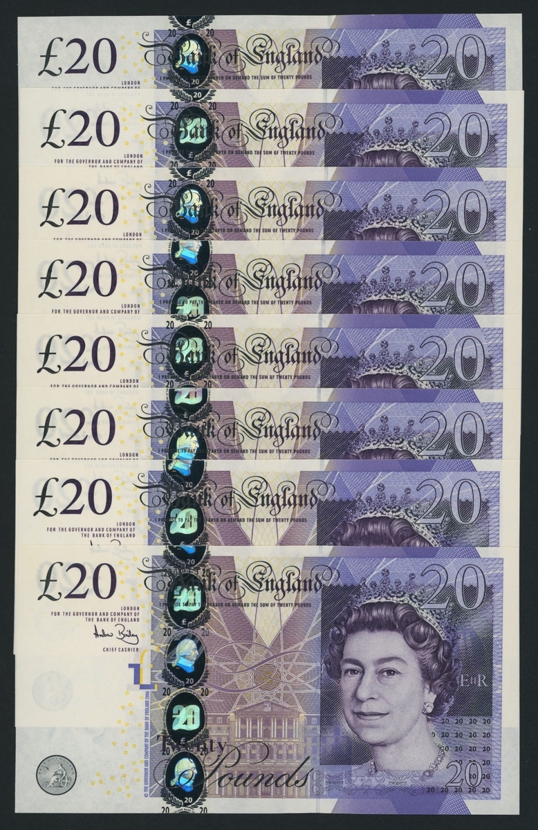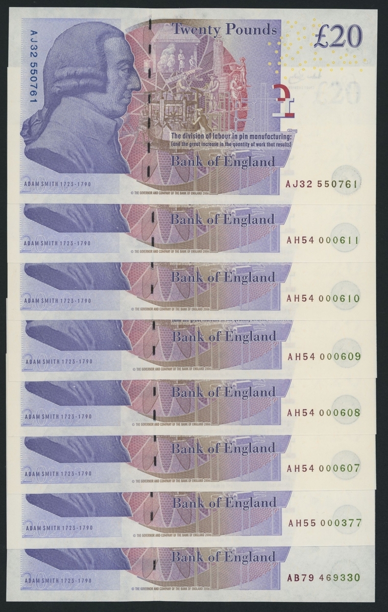 Bank of England, Andrew Bailey, [8 notes] £20, 2006, including run of consecutive serial numbers AH54 000607-611 and serial numbers AB79 469330, AH55 000377 and AJ32 550761,