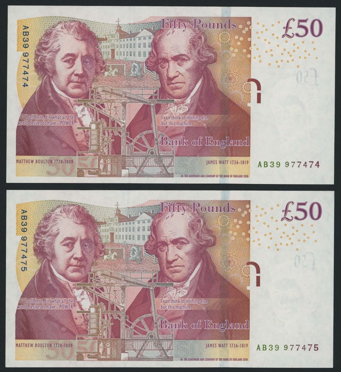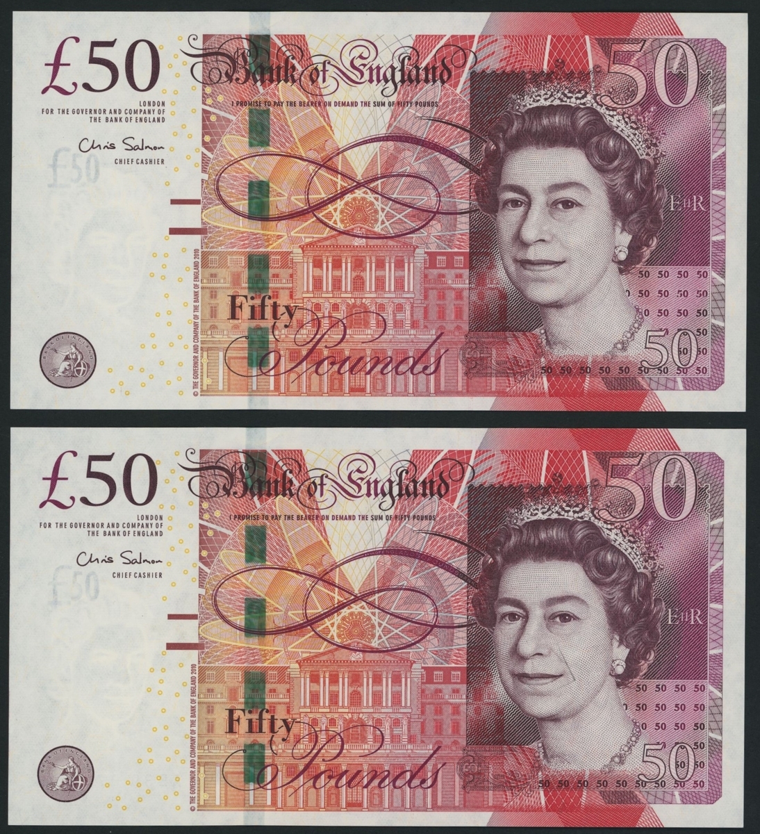 Bank of England, C. Salmon, [2 notes] consecutive pair of £50 notes, ND (2011), serial numbers AB39 977474, 75, (EPM B410), both notes about uncirculated, security thread insertion crease (2 notes)
