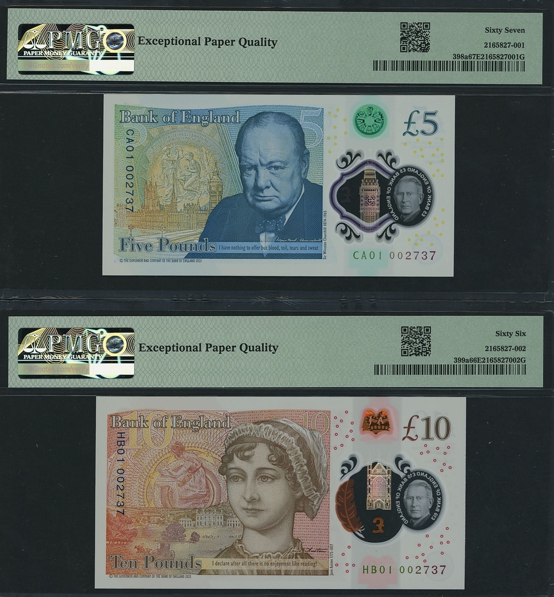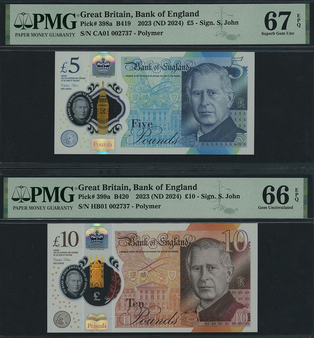 Bank of England, Sarah John, a complete set of £5, £10, £20 and £50, matching first run serial numbers: CA01 002737 HB01 002737 EH01 002737 AJ01 002737
