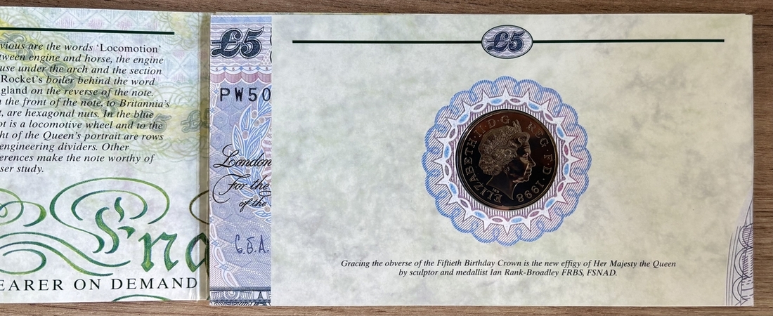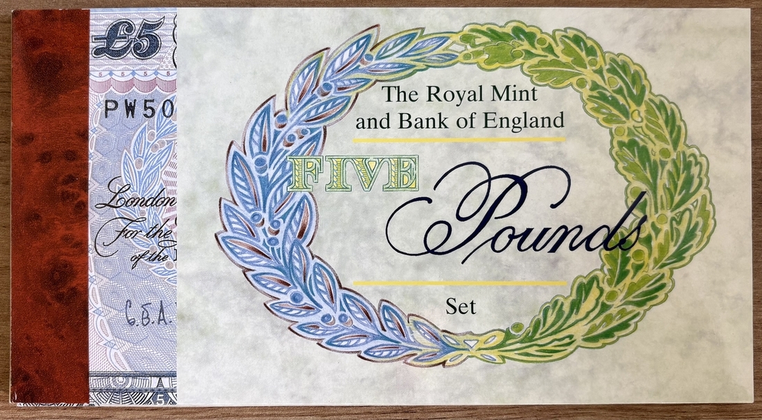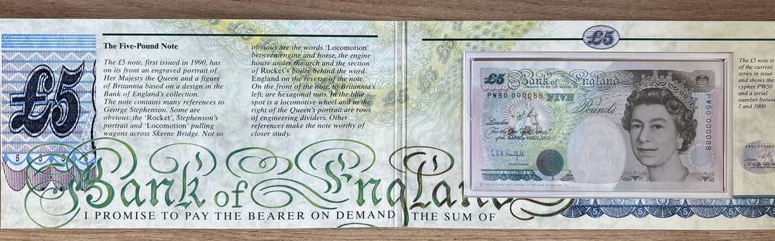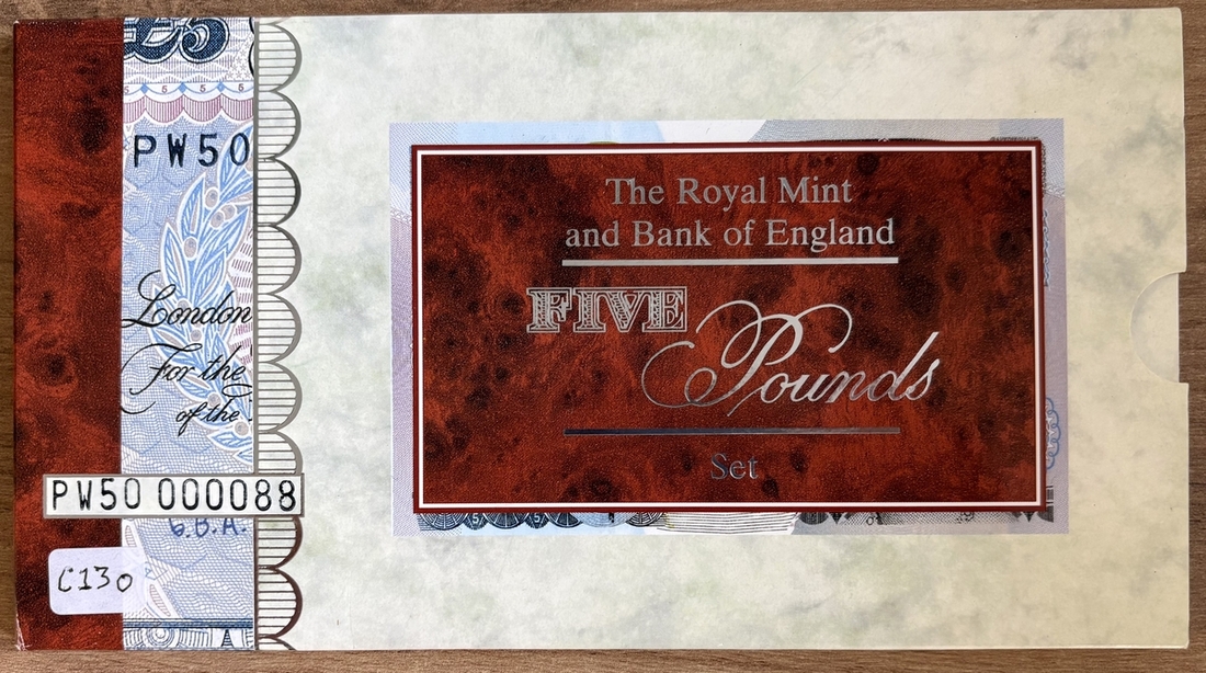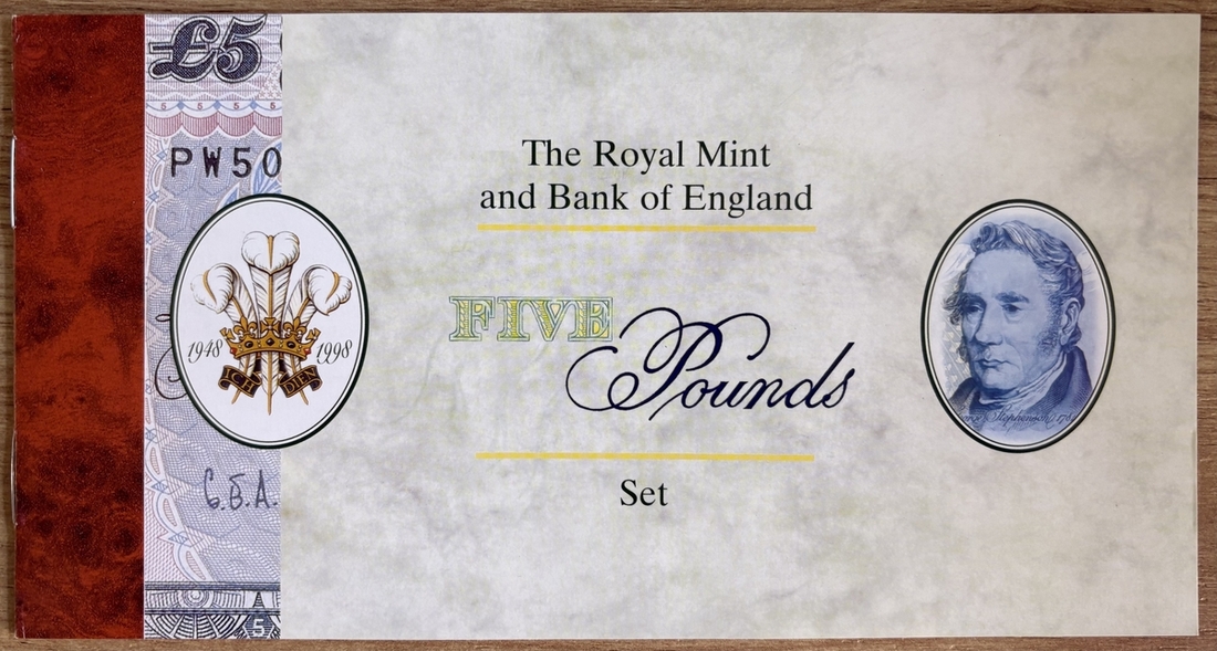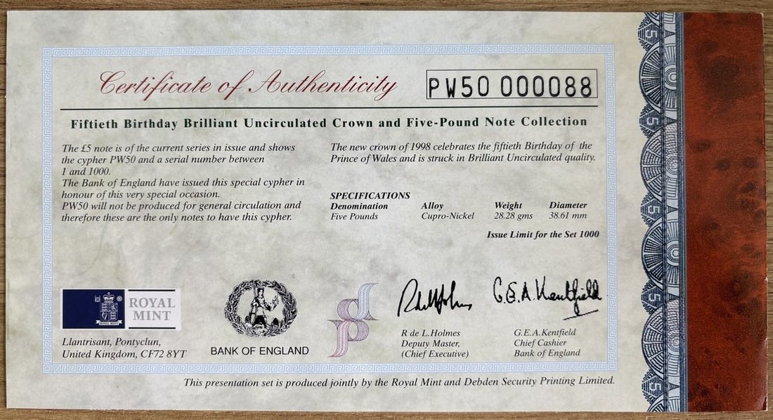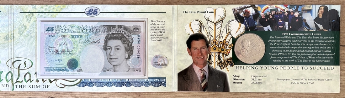 Debden Security Printing, Prince of Wales 50th Birthday, £5 set, 1998, G. E. A. Kentfield, serial number PW50 000088 including cupro-nickel £5 coin,