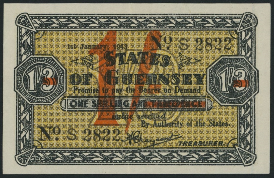 (x) States of Guernsey, 1 Shilling Overprint on 1 Shilling and Threepence, 1st January 1943, serial number S2822, (Pick 29, BNB 140), about uncirculated, one vertical fold, rare in this condition