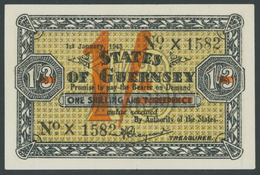 (x) States of Guernsey, 1 Shilling Overprint on 1 Shilling and Threepence, 1st January 1943, serial number X1582, (Pick 29, BNB 140), solid good extremely fine, pressed and one small tear to margin