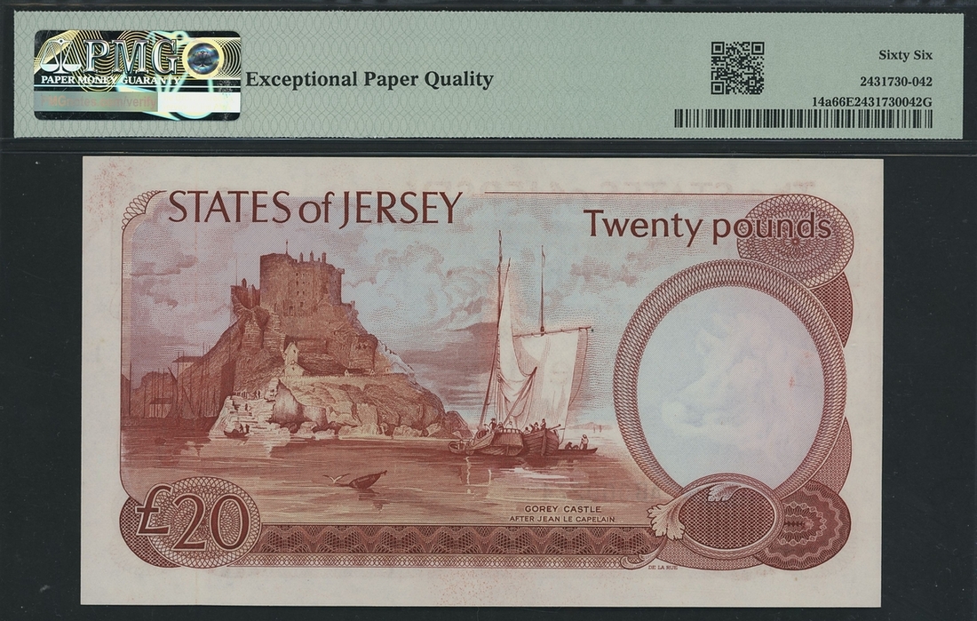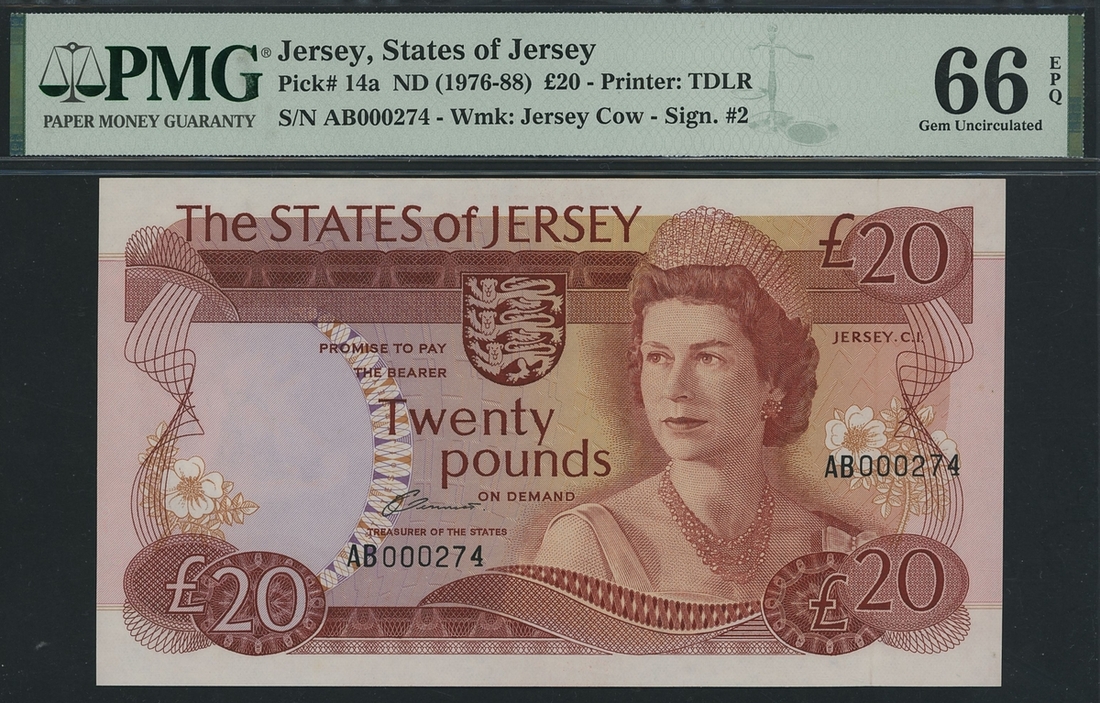 (x) States of Jersey, £20, ND (1976-88), first prefix low serial number AB 000274, (Pick 14a), in PMG holder 66 EPQ Gem Uncirculated