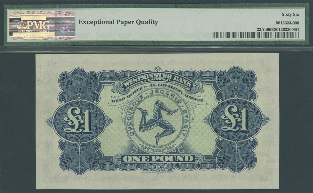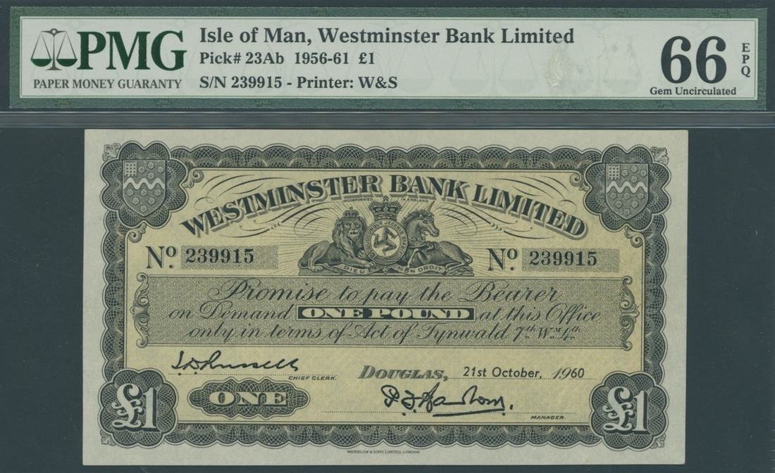 (x) Westminster Bank Limited, *TOP POP* £1, Douglas, 21st October 1960, serial number 239915, (Pick 23Ab, IOMPM M314), in PMG holder 66 EPQ Gem Uncirculated, tied for finest graded note on PMG Census!