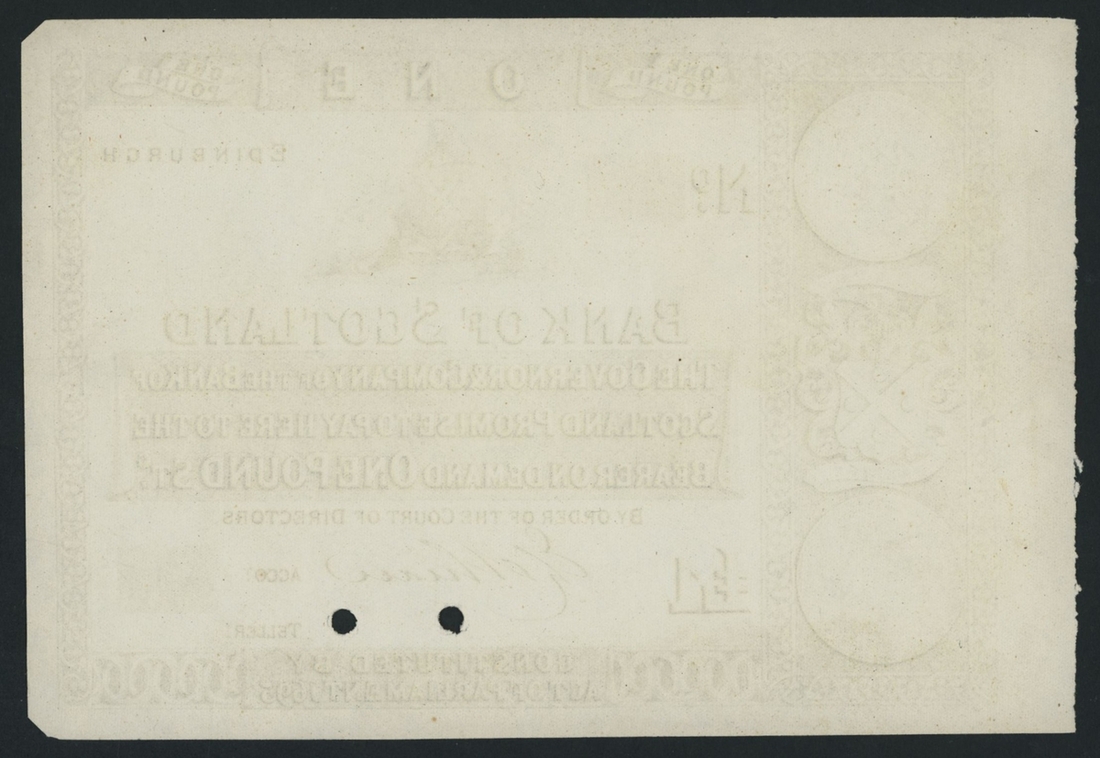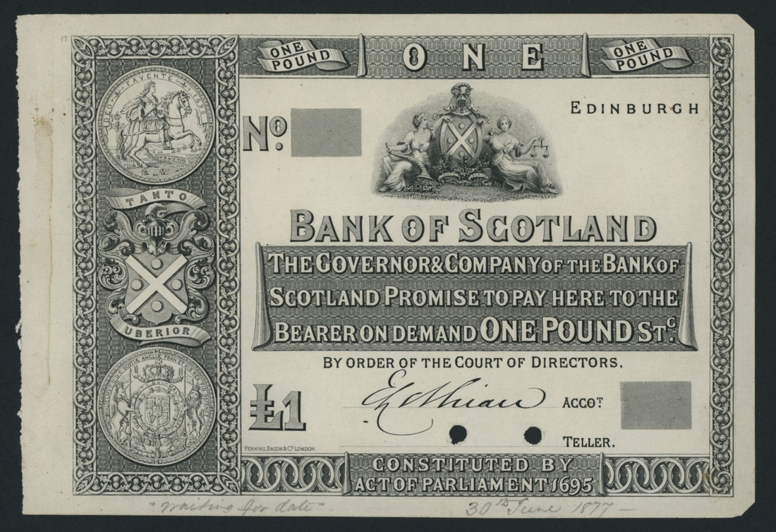 (x) Bank of Scotland, proof £1, Edinburgh, ND (circa. 1860-1884), pencil annotation and date '30th June 1877' on obverse, Perkin's, Bacon & Co. engraving, '17' in the upper left margin,
