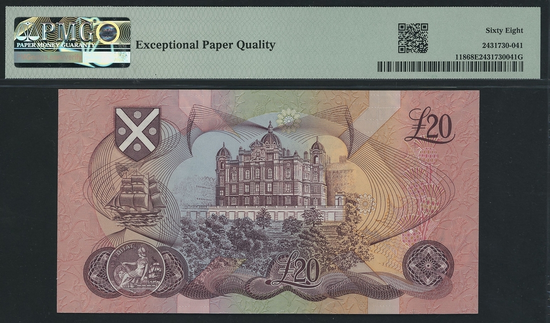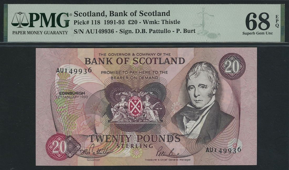 (x) Bank of Scotland, £20, 12th January 1993, final prefix, high serial number AU 149936, (PMS BA 119), in PMG holder 68 EPQ Superb Gem Uncirculated, only 1 note in a higher grade on PMG census