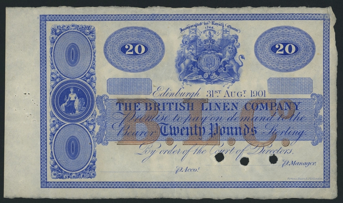 (x) British Linen Company, specimen £20, Edinburgh, 31st August 1901, blue and white, Bank initials in red-brown at centre, arms top centre, Britannia at left,