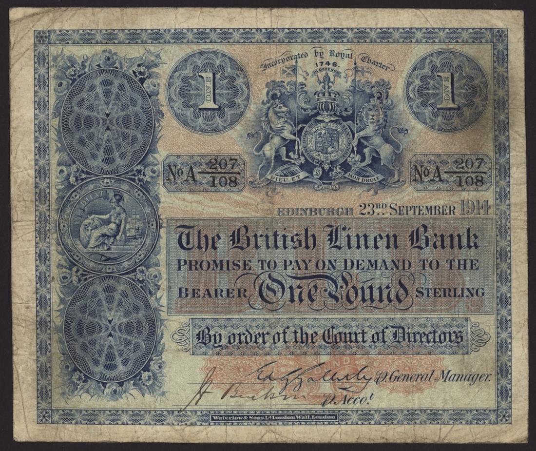 (x) British Linen Bank, £1, Edinburgh, 23rd September 1914, serial number A 207/108, (PMS BL 59a), very fine