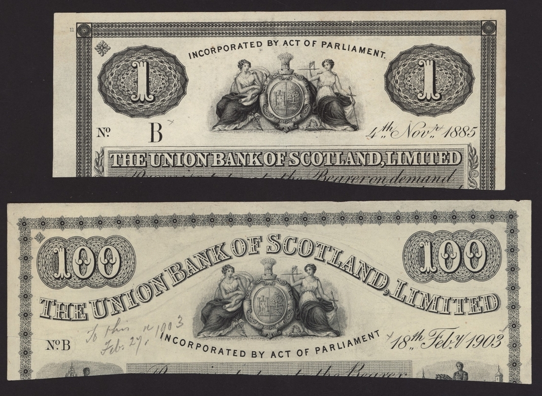 (x) Union Bank of Scotland, [2 notes] cut cancelled £1 and £100 proofs, cut cancelled half £1 proof, 4th November 1885, prefix B,
