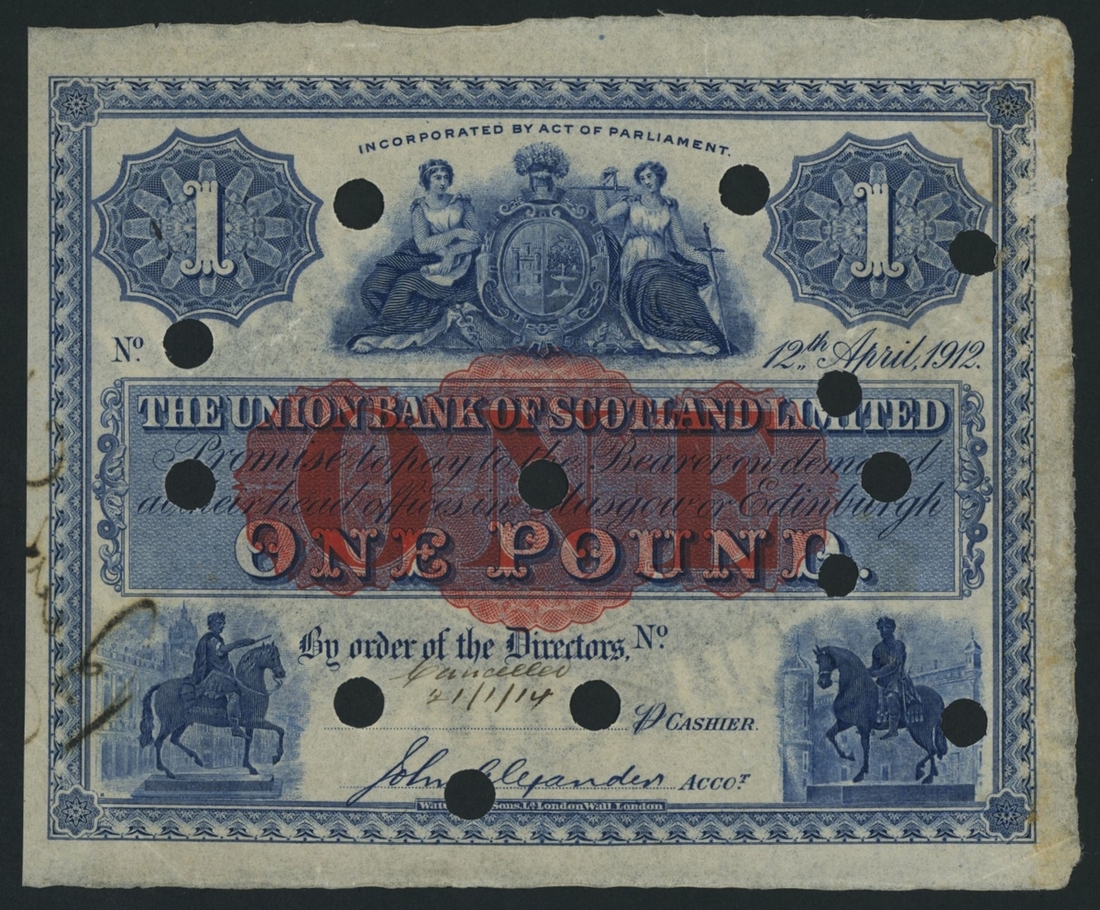 (x) Union Bank of Scotland Limited, proof £1, Edinburgh, 12th April 1912, though the date and design are listed (PMS UB 57c), a proof is unlisted for this note,