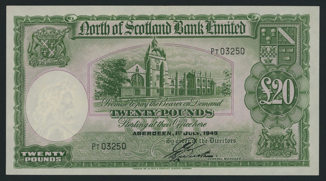(x) North of Scotland Bank Limited, £20, Aberdeen, 1st July 1949, serial number PT03250, (PMS NS 45b), about uncirculated, light crease