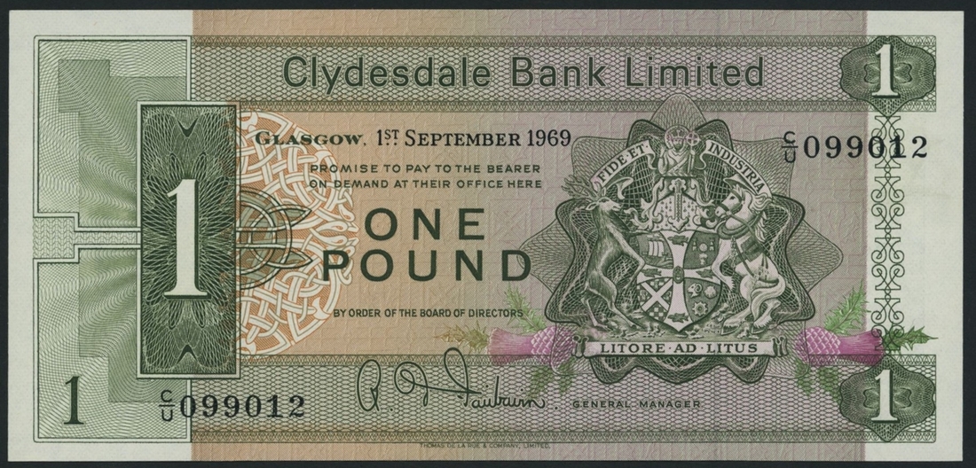(x) Clydesdale Bank PLC, £10, Glasgow, 1st September 1969, serial number C/U 099012, plate note featured in the Standard Catalogue of World Paper Money 23rd, 24th, and 25th Editions,