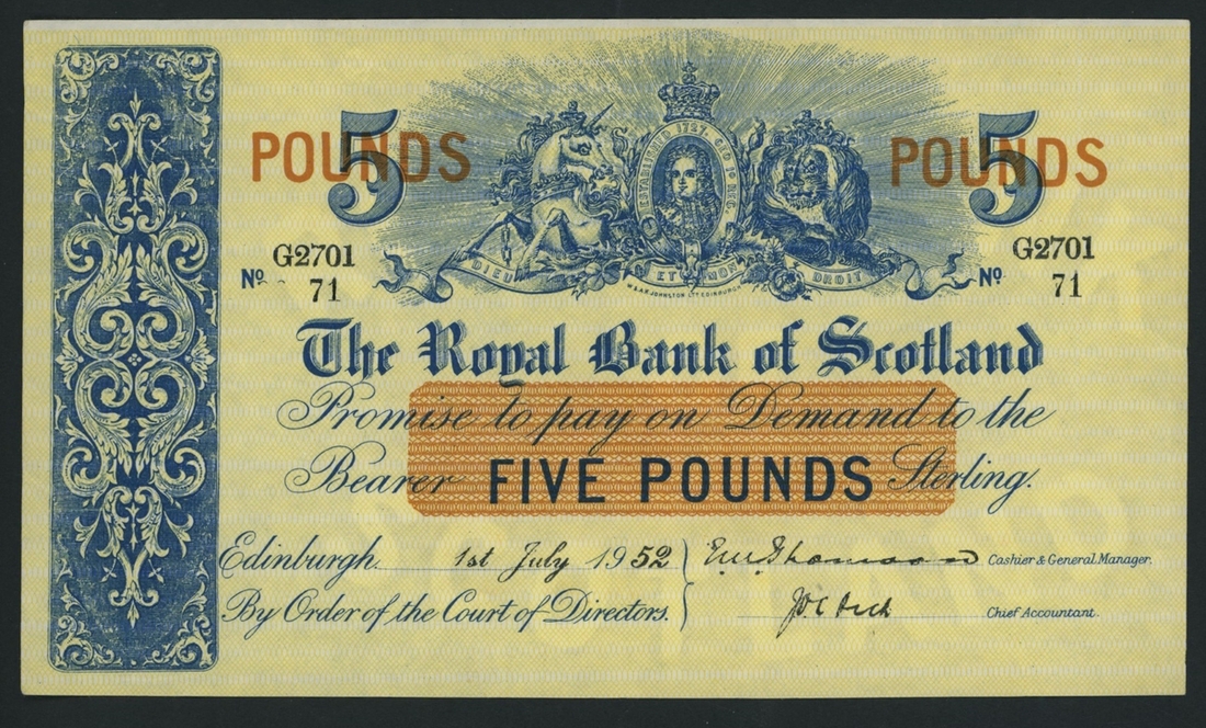 The Royal Bank of Scotland, £5, Edinburgh, 1st July 1952, serial number G2701, (PMS RB58a), creases, otherwise about extremely fine