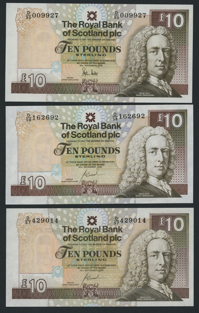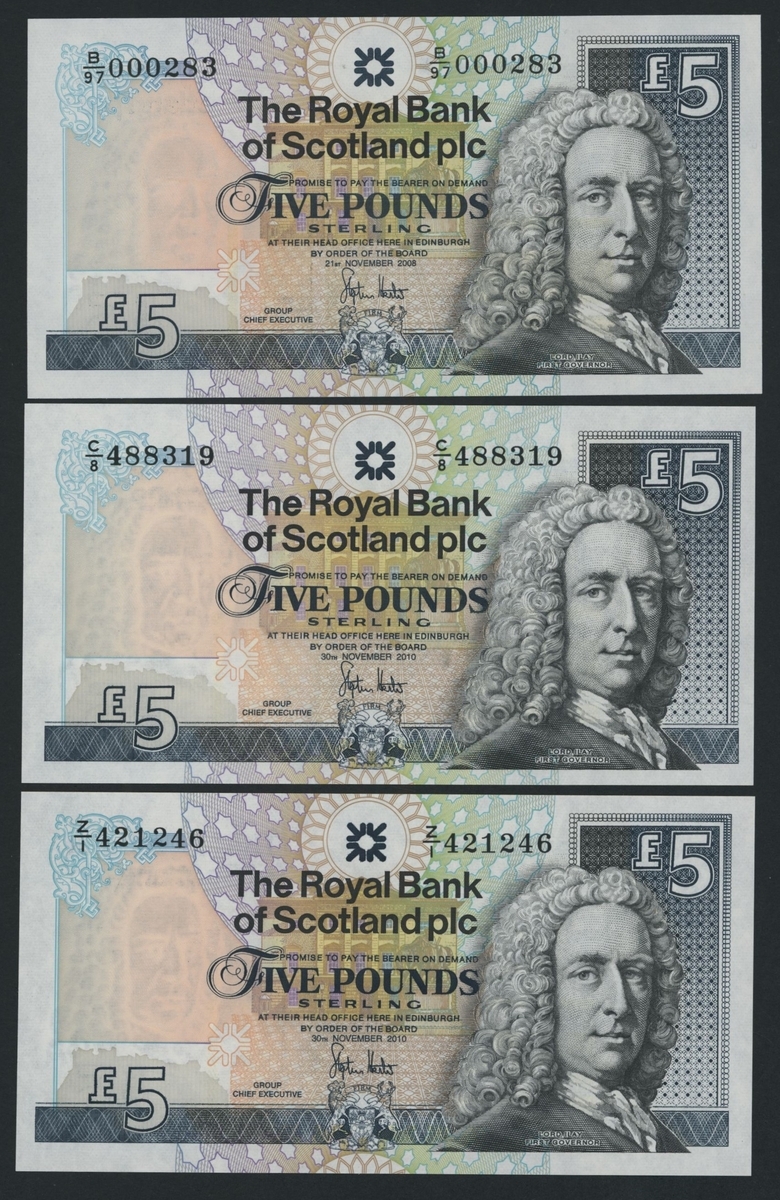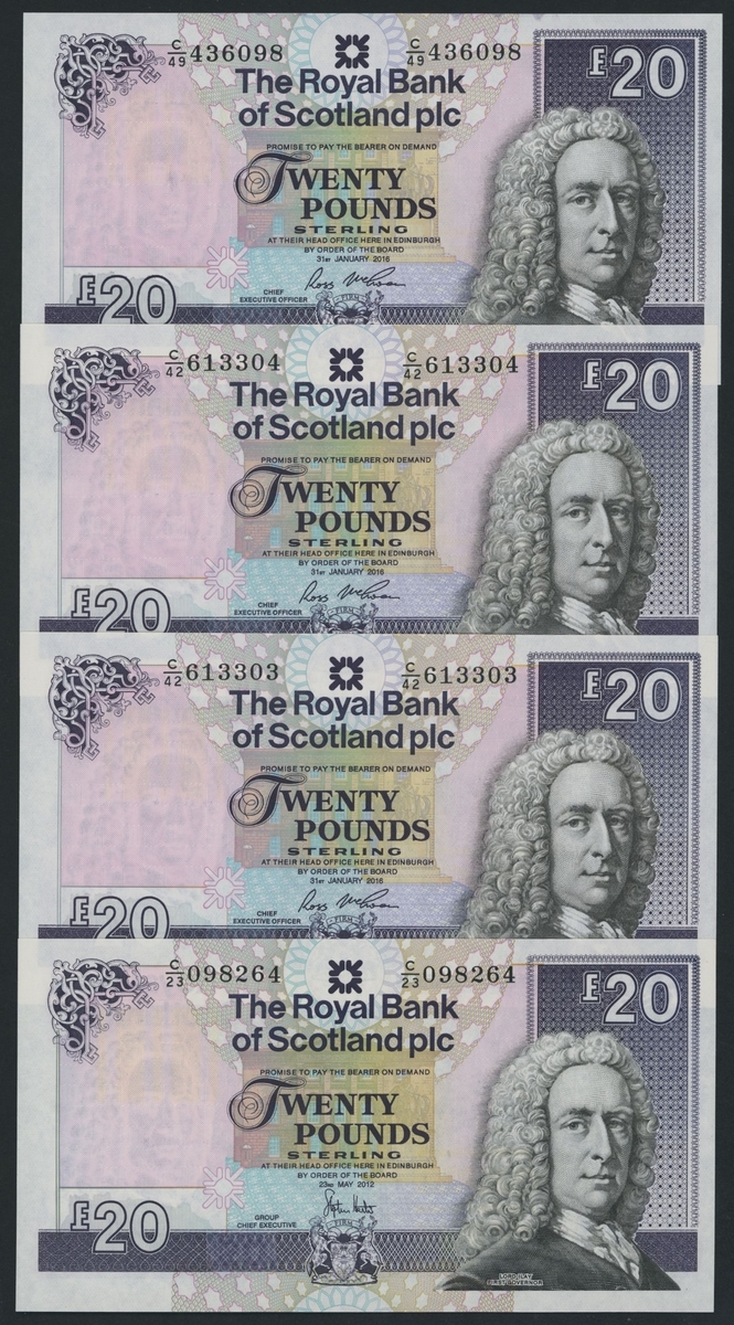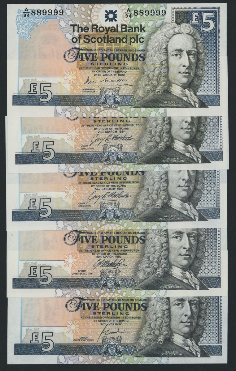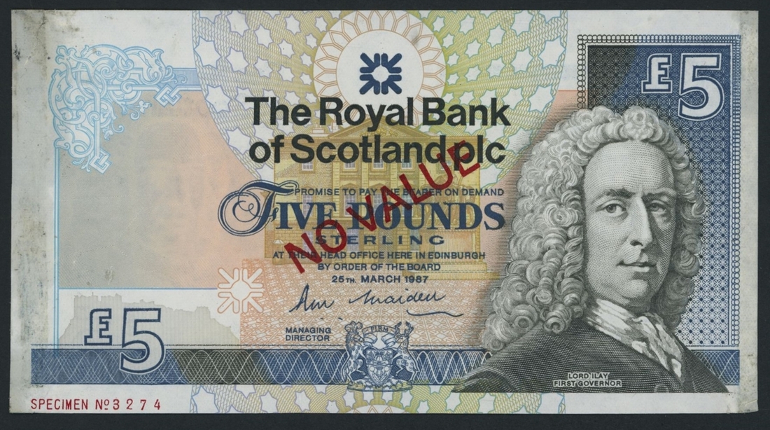 (x) Royal Bank of Scotland, [30 notes] £5, £10, £20, Edinburgh, 1987-2016, including a De La Rue specimen with NO VALUE overprint and 2 reverse progressive proofs (PMS RB 97b proof),