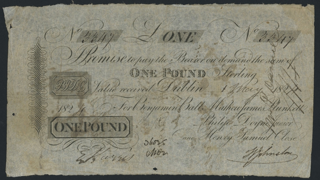 Ireland, £1, Dublin, 1st May 1824, serial number 3347, no watermark, a possible contemporary forgery,