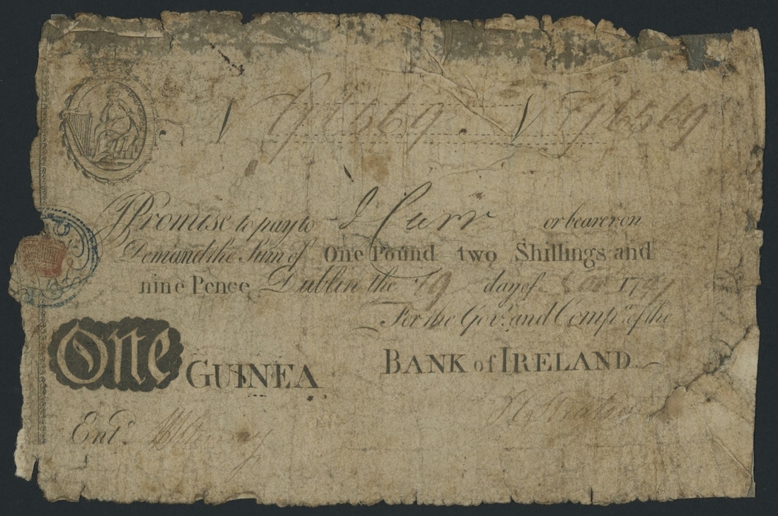 Bank of Ireland, 1 Guinea, Dublin, dated 19th [?] 1791, serial number G6569, (PMI BA 2), solid fair, ink annotations on reverse, rare