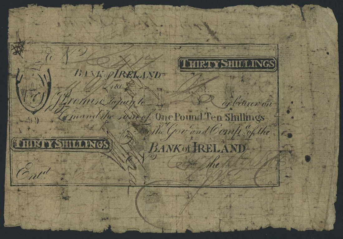 Bank of Ireland, 30 Shillings forgery, 11th April 1809, (PMI BA12), fair with internal tears and holes, ink annotations